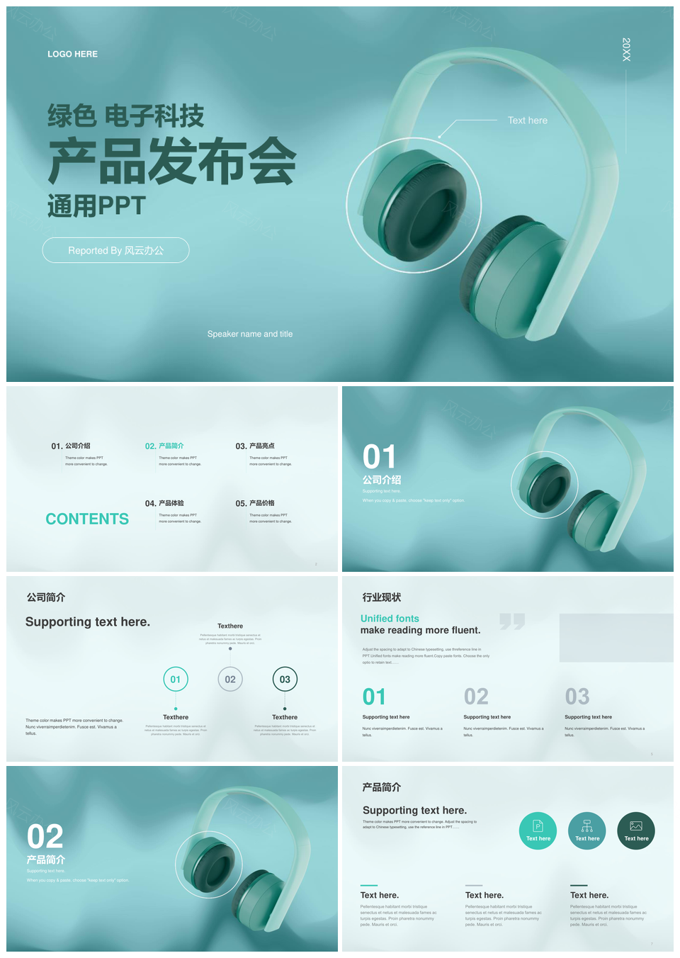 风云办公提供的绿色创意头戴式电子科技耳机发布会PPT模板,下载格式为pptx,一共20页,作品中文字及图均可以修改和编辑,图片更改请在作品中右键图片并更换,文字修改请直接点击文字进行修改。