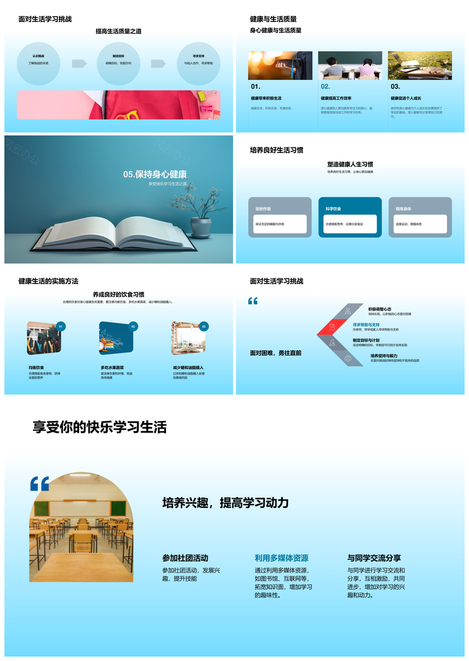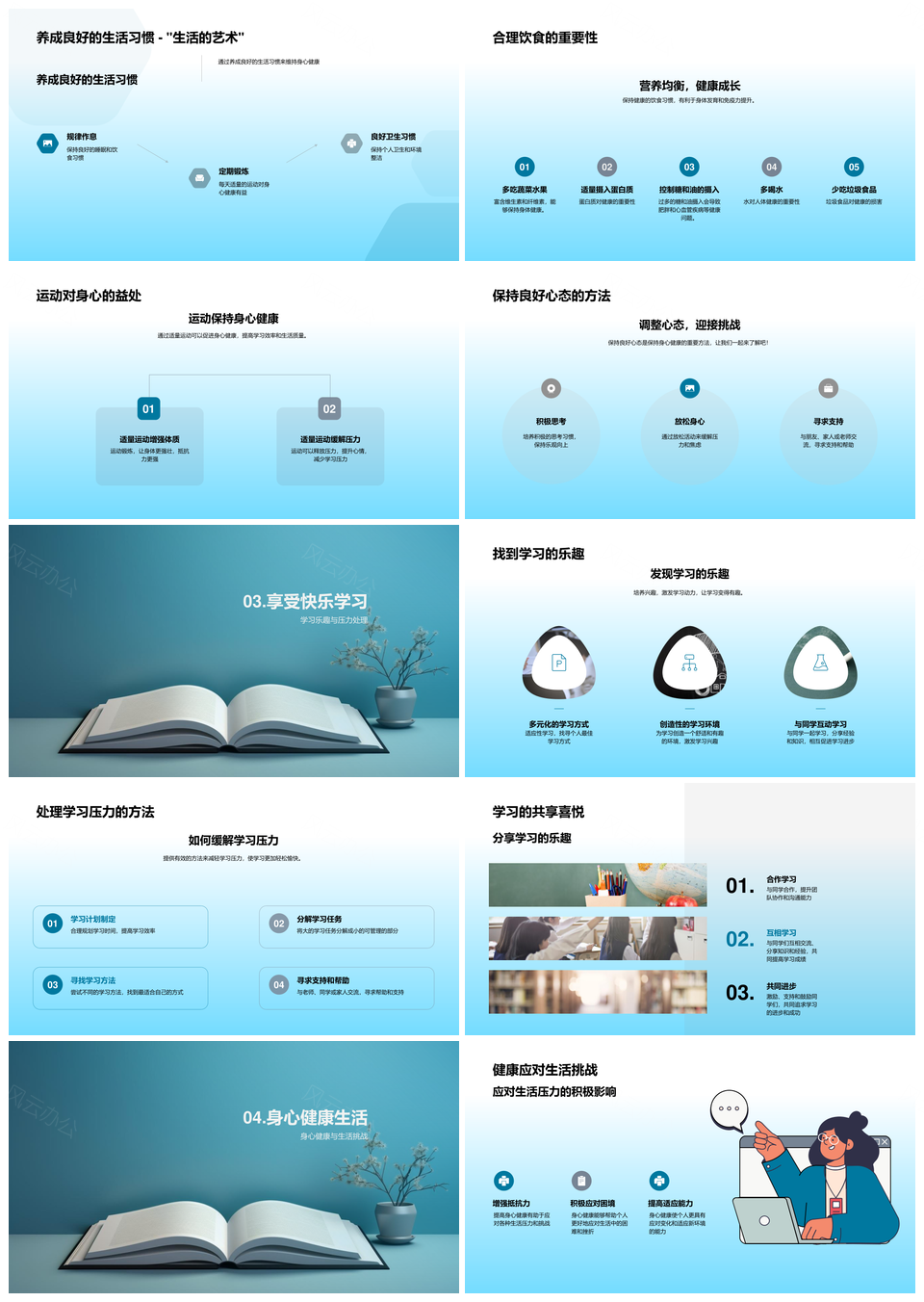 风云办公提供的健康生活乐学身心高效优质PPT模板,下载格式为pptx,一共25页,作品中文字及图均可以修改和编辑,图片更改请在作品中右键图片并更换,文字修改请直接点击文字进行修改。