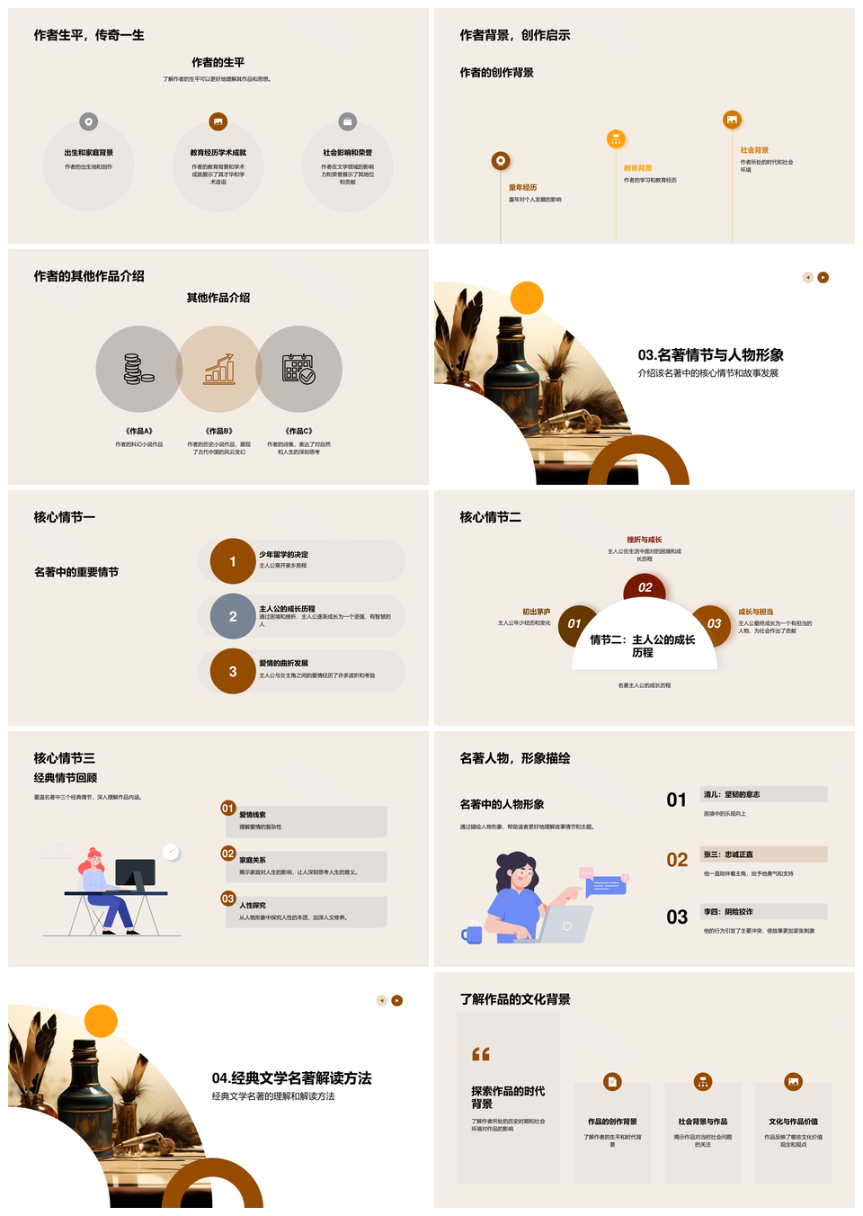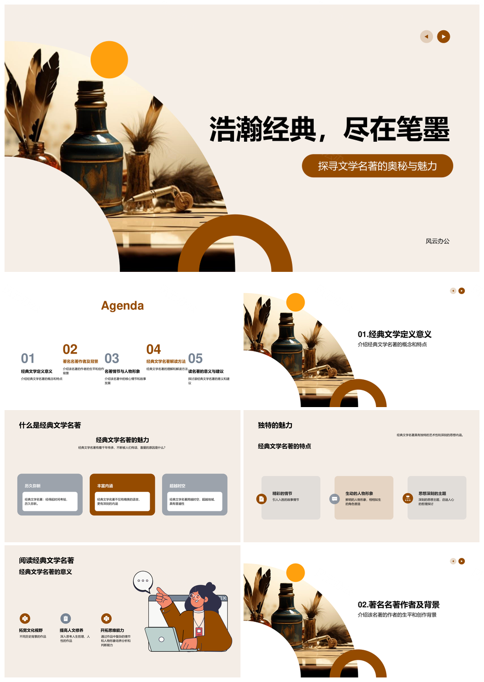 风云办公提供的经典文学名著解读与要素解析复古风课件,下载格式为pptx,一共24页,作品中文字及图均可以修改和编辑,图片更改请在作品中右键图片并更换,文字修改请直接点击文字进行修改。