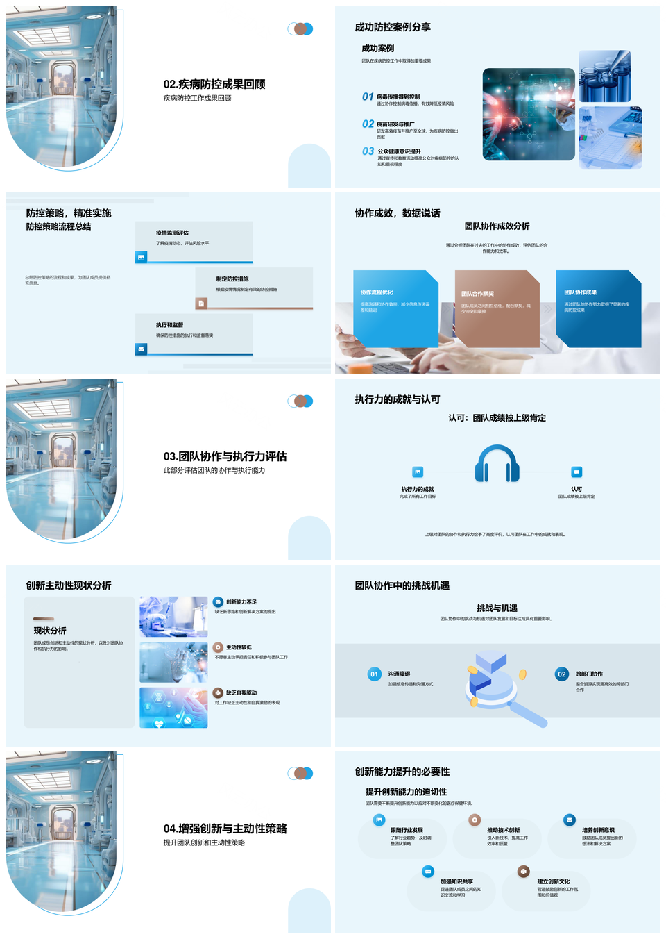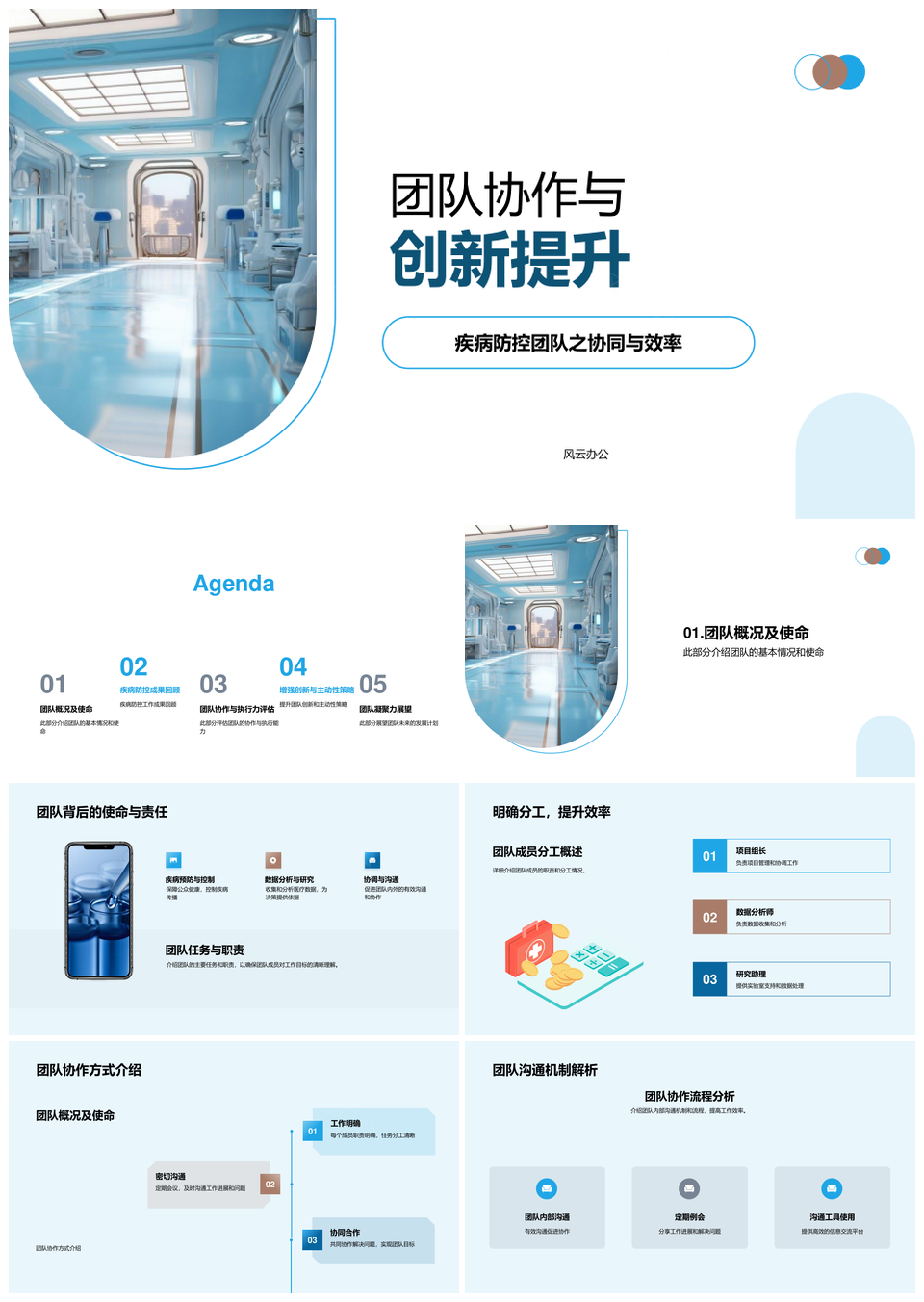 风云办公提供的团队协作创新提升疾病防控协同效率PPT模板,下载格式为pptx,一共24页,作品中文字及图均可以修改和编辑,图片更改请在作品中右键图片并更换,文字修改请直接点击文字进行修改。