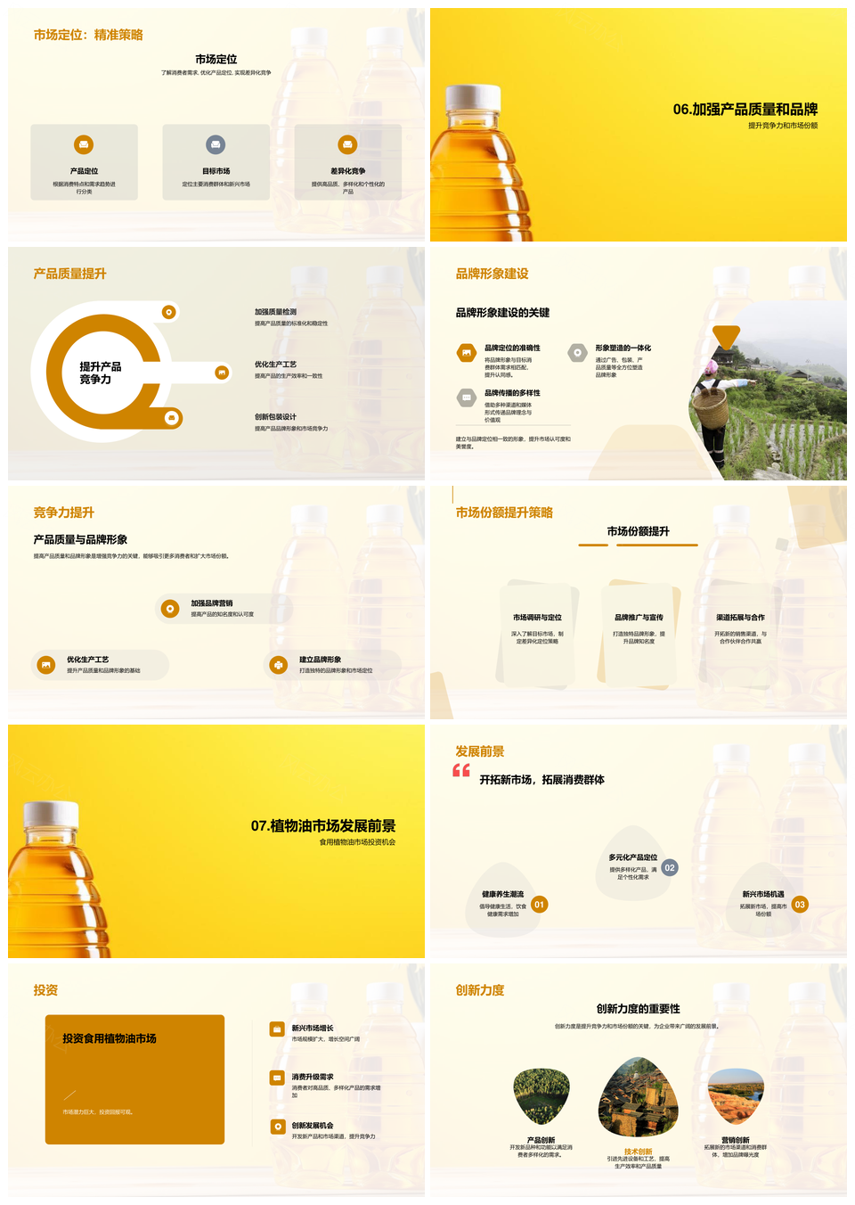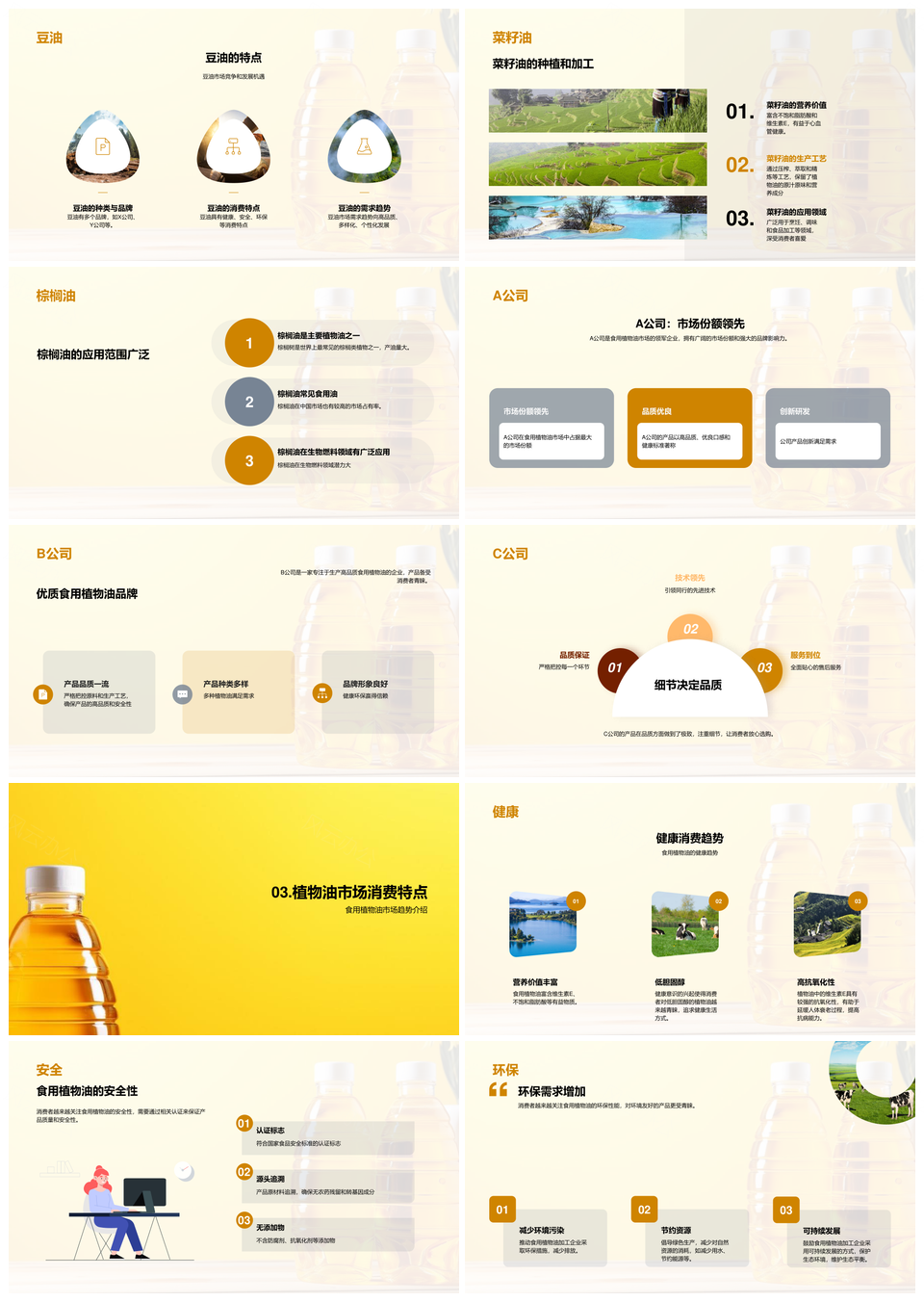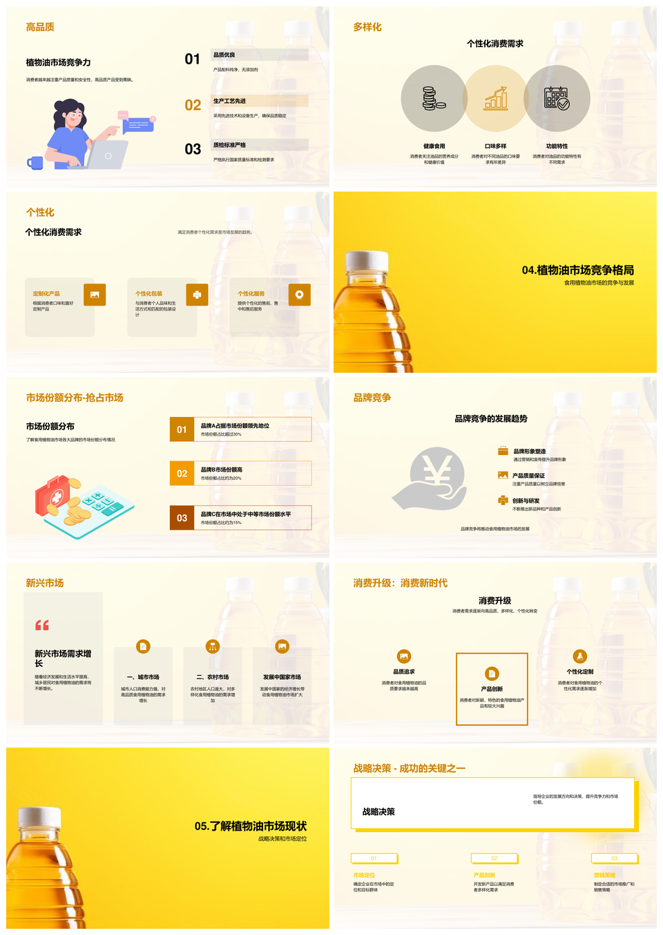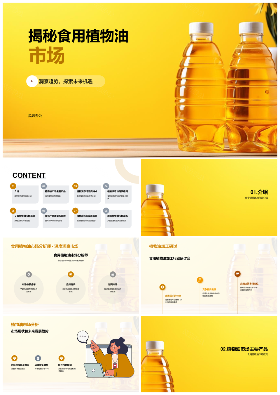 这是一张食用植物油市场现状趋势及产品品牌解析PPT模板,包含食用植物油、市场、现状、趋势、产品、品牌、解析等主题内容,也可用作食用植物油市场现状、植物油市场现状趋势、食用植物油现状趋势、食用植物油市场、植物油市场现状、市场现状趋势、产品品牌解析、食用植物油、植物油市场、市场现状、现状趋势、产品品牌、品牌解析、现状趋势产品、趋势产品品牌等PPT场景使用。 风云办公提供的食用植物油市场现状趋势及产品品牌解析PPT模板,下载格式为pptx,一共43页,作品中文字及图均可以修改和编辑,图片更改请在作品中右键图片并更换,文字修改请直接点击文字进行修改。