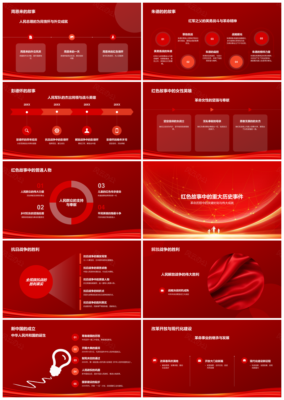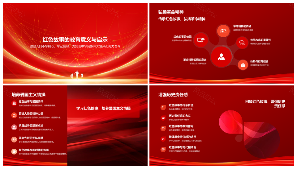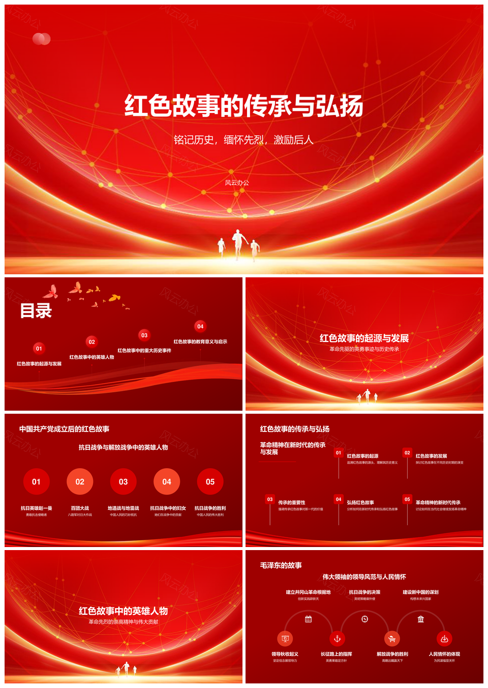 风云办公提供的红色党政历史精神弘扬事迹故事PPT模板,下载格式为pptx,一共22页,作品中文字及图均可以修改和编辑,图片更改请在作品中右键图片并更换,文字修改请直接点击文字进行修改。