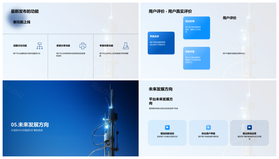 风云办公提供的科创平台月度总结新功能未来发展方向PPT模板,下载格式为pptx,一共22页,作品中文字及图均可以修改和编辑,图片更改请在作品中右键图片并更换,文字修改请直接点击文字进行修改。