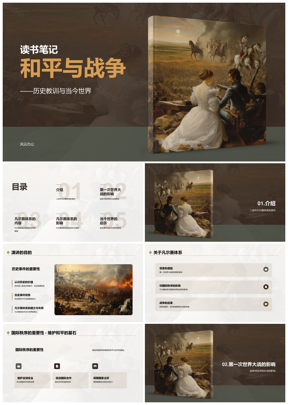 这是一张世界大战凡尔赛体系战争遗产背景原因影响启示PPT模板,包含世界大战、凡尔赛体系、战争遗产、背景、原因、影响、启示等主题内容,也可用作世界大战凡尔赛体系战争遗产背景原因、世界大战凡尔赛体系战争遗产、凡尔赛体系战争遗产背景原因、世界大战战争遗产背景原因、战争遗产背景原因影响启示、凡尔赛体系遗产背景原因影响、世界大战凡尔赛体系背景、战争遗产背景原因影响、背景原因影响启示、世界大战战争遗产背景、凡尔赛体系战争遗产、世界大战背景原因影响、战争遗产背景原因、遗产背景原因影响、凡尔赛体系影响启示等PPT场景使用。 风云办公提供的世界大战凡尔赛体系战争遗产背景原因影响启示PPT模板,下载格式为pptx,一共20页,作品中文字及图均可以修改和编辑,图片更改请在作品中右键图片并更换,文字修改请直接点击文字进行修改。
