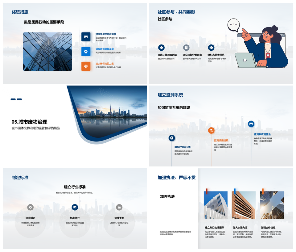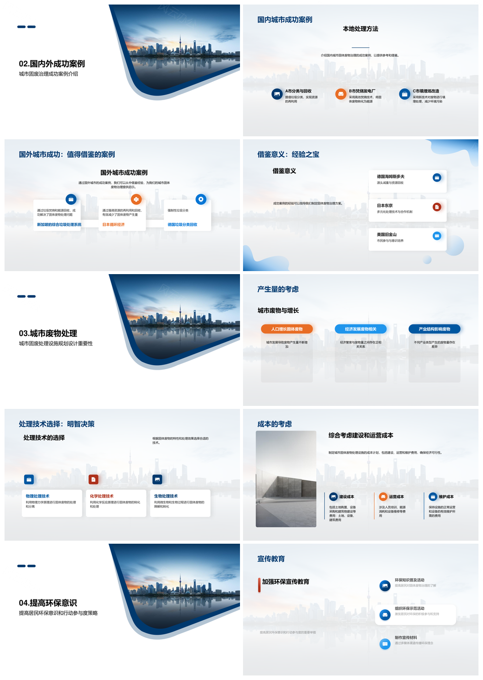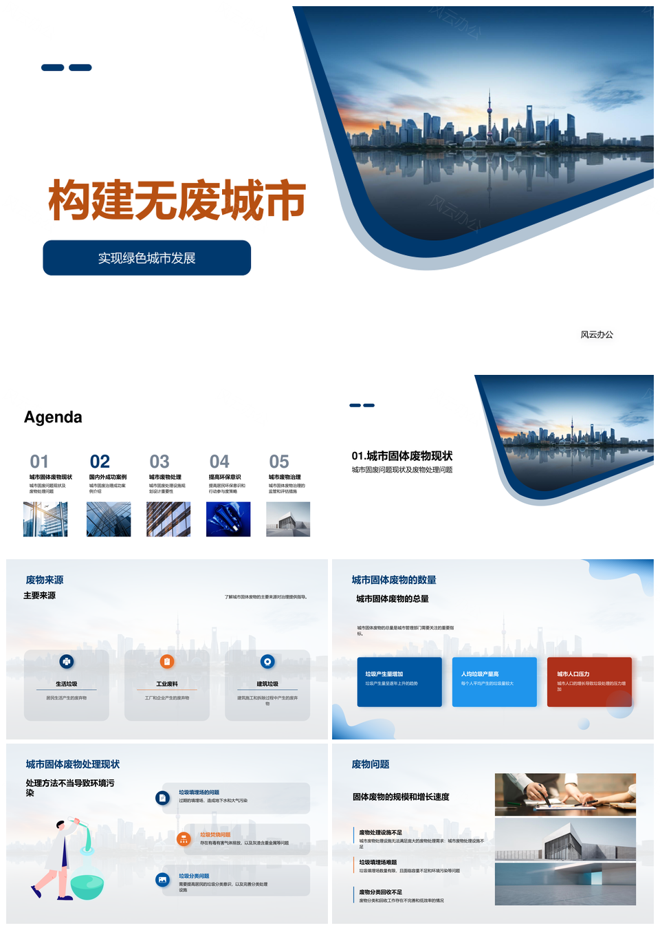 风云办公提供的城市固体废物治理规划与处理现状分析PPT模板,下载格式为pptx,一共24页,作品中文字及图均可以修改和编辑,图片更改请在作品中右键图片并更换,文字修改请直接点击文字进行修改。