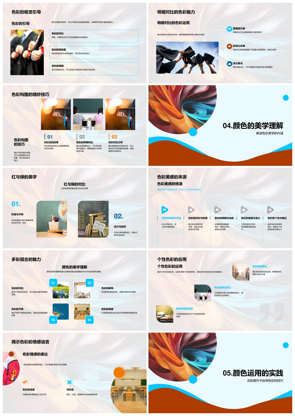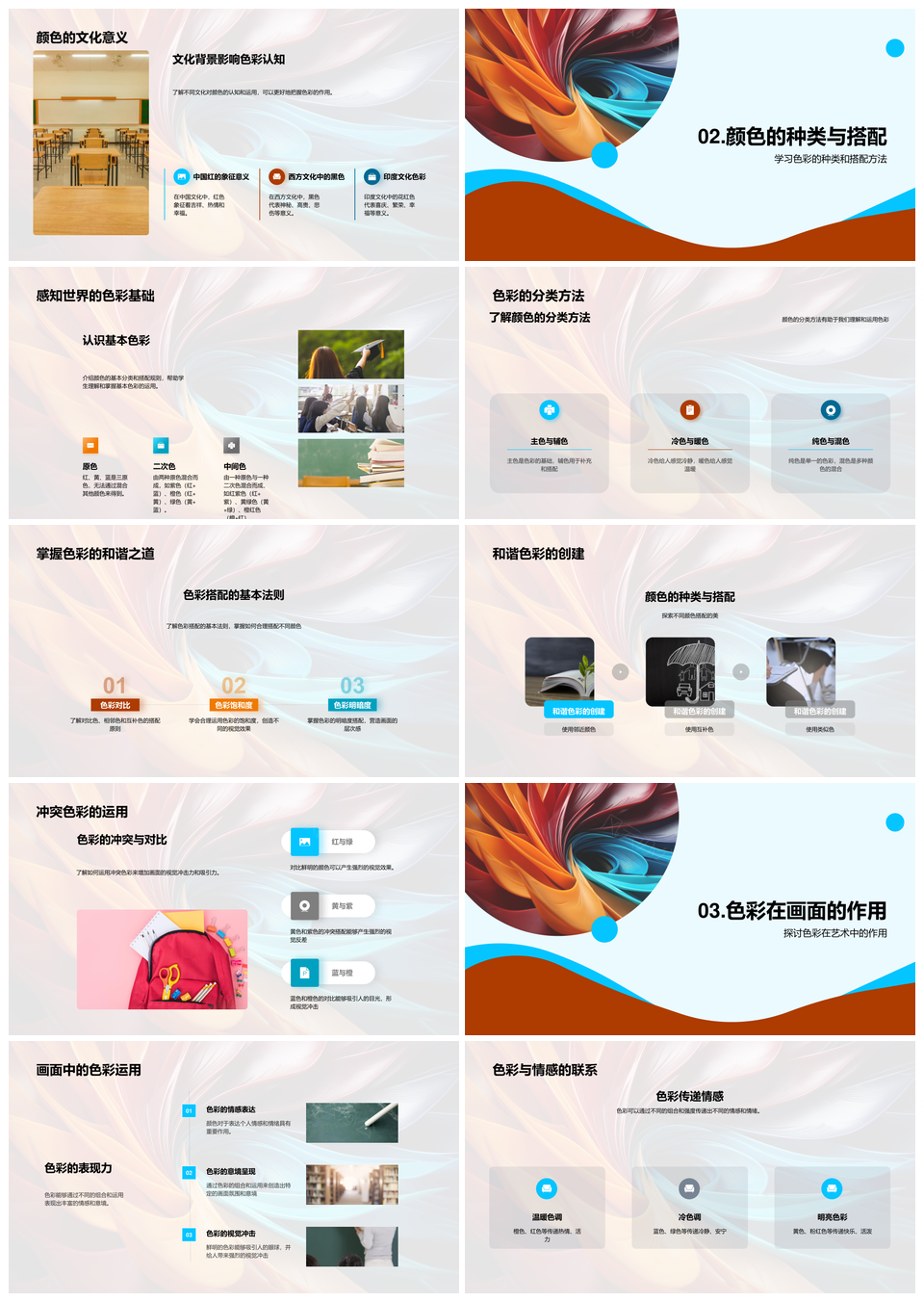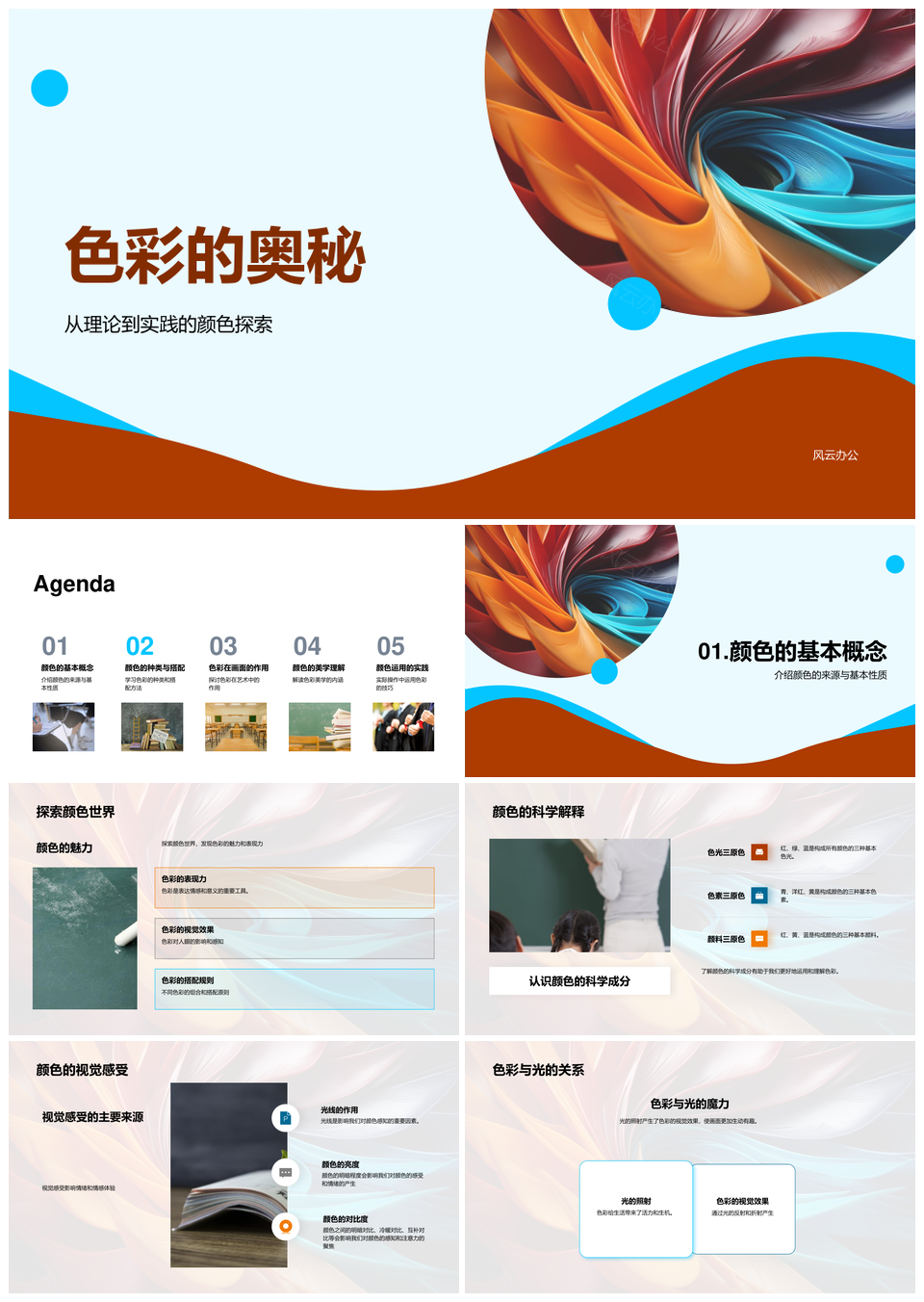 风云办公提供的色彩奥秘色轮探源搭配和谐冲突视觉PPT模板,下载格式为pptx,一共33页,作品中文字及图均可以修改和编辑,图片更改请在作品中右键图片并更换,文字修改请直接点击文字进行修改。