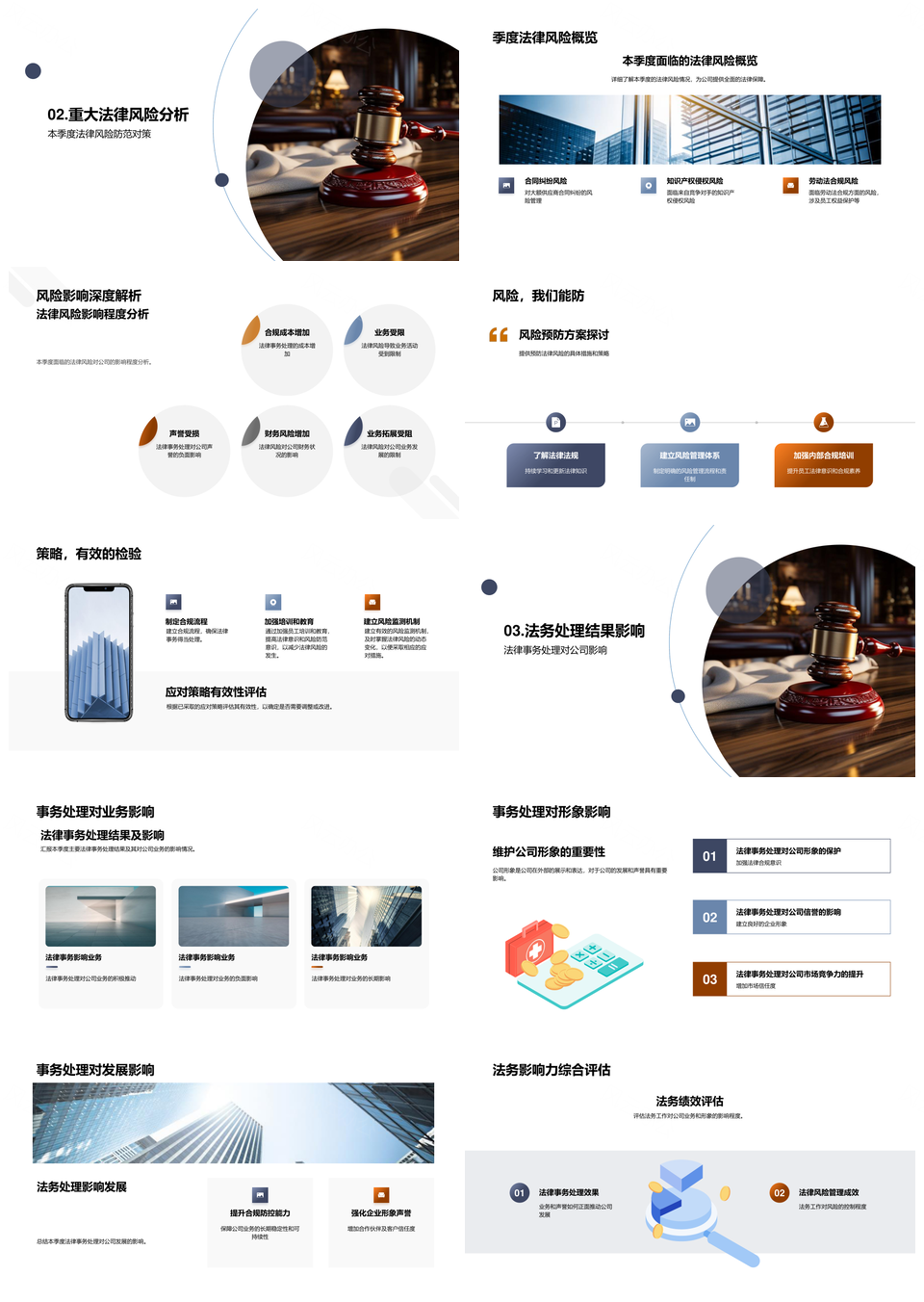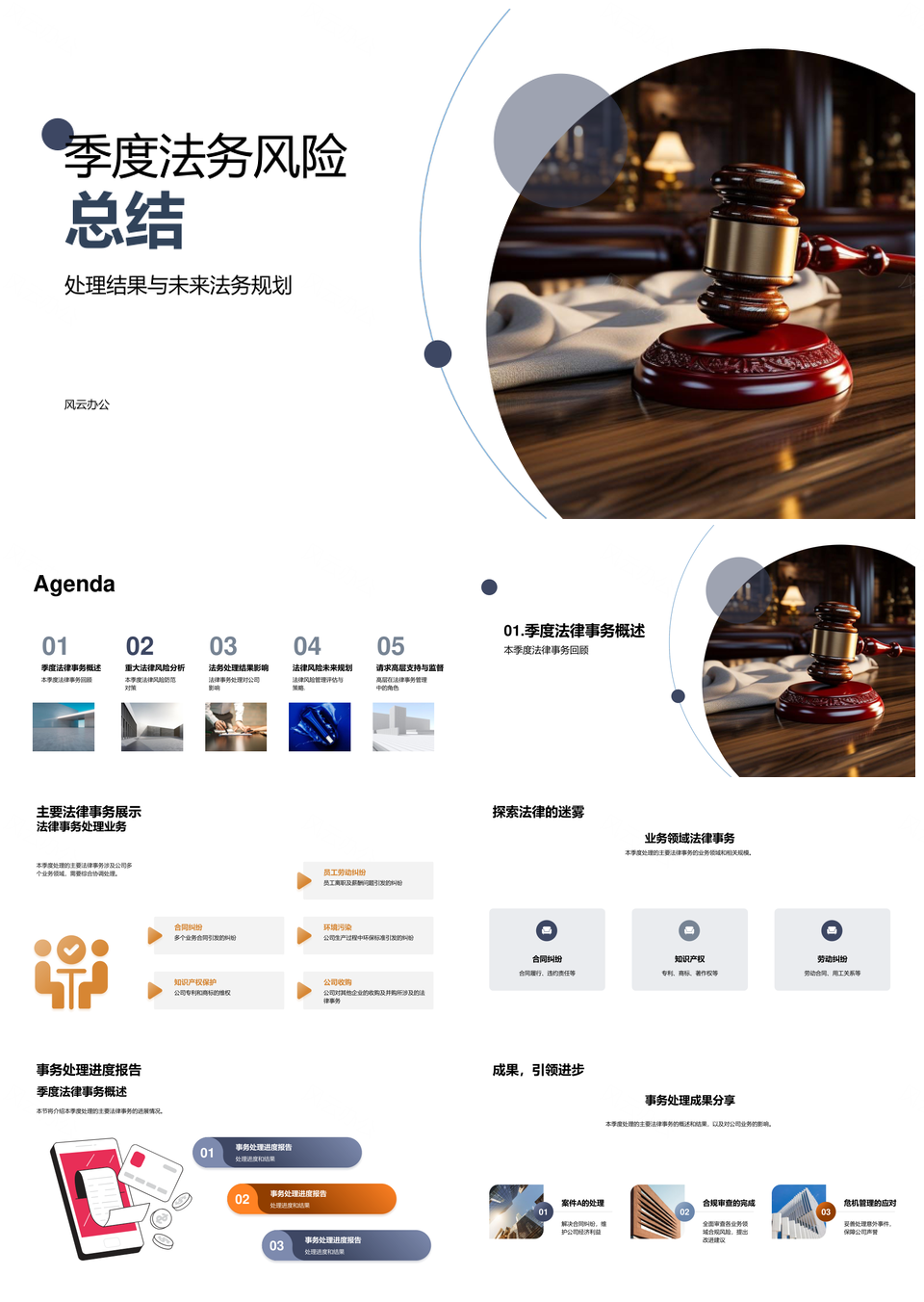 这是一张季度法务风险处理成果与重大风险预防分析PPT模板,包含季度、法务风险、处理成果、重大风险、预防分析等主题内容,也可用作季度法务风险处理成果、法务风险处理成果重大、风险处理成果重大风险、处理成果重大风险预防、成果重大风险预防分析、季度法务风险处理、法务风险处理成果、风险处理成果重大、处理成果重大风险、成果重大风险预防、重大风险预防分析、季度法务风险、法务风险处理、风险处理成果、处理成果重大等PPT场景使用。 风云办公提供的季度法务风险处理成果与重大风险预防分析PPT模板,下载格式为pptx,一共28页,作品中文字及图均可以修改和编辑,图片更改请在作品中右键图片并更换,文字修改请直接点击文字进行修改。