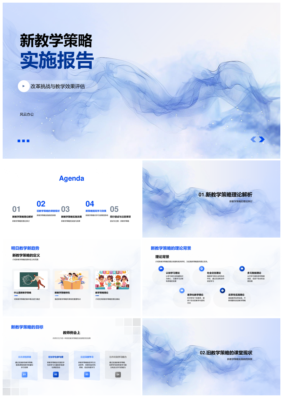 这是一张新教学策略实施步骤效果评估学生反馈报告PPT模板,包含新教学策略、实施步骤、效果评估、学生反馈、报告等主题内容,也可用作教学策略实施步骤、实施步骤效果评估、效果评估学生反馈、学生反馈报告、教学策略实施、实施步骤效果、步骤效果评估、效果评估学生、评估学生反馈、教学策略、策略实施、实施步骤、步骤效果、效果评估、学生反馈等PPT场景使用。 风云办公提供的新教学策略实施步骤效果评估学生反馈报告PPT模板,下载格式为pptx,一共23页,作品中文字及图均可以修改和编辑,图片更改请在作品中右键图片并更换,文字修改请直接点击文字进行修改。