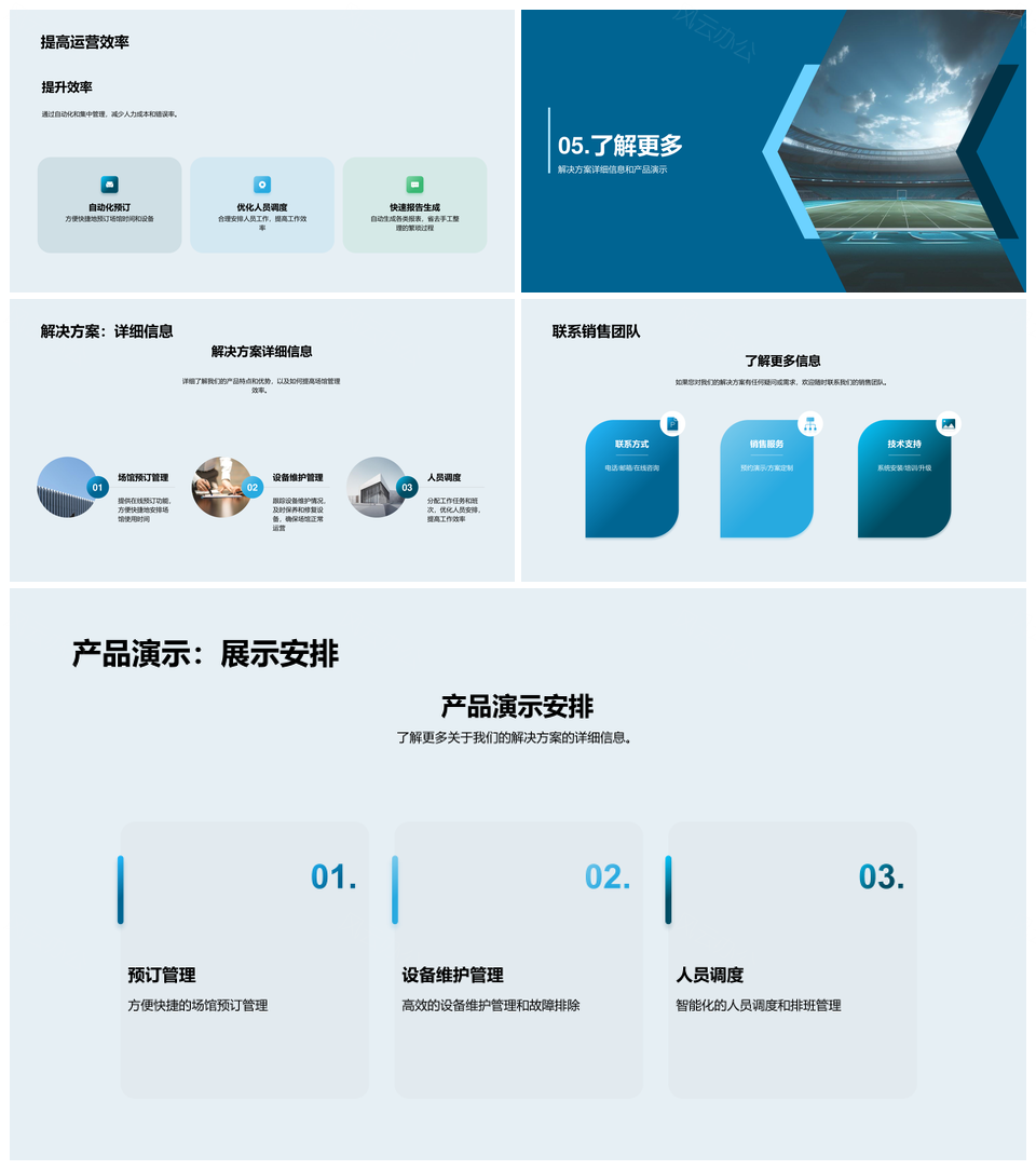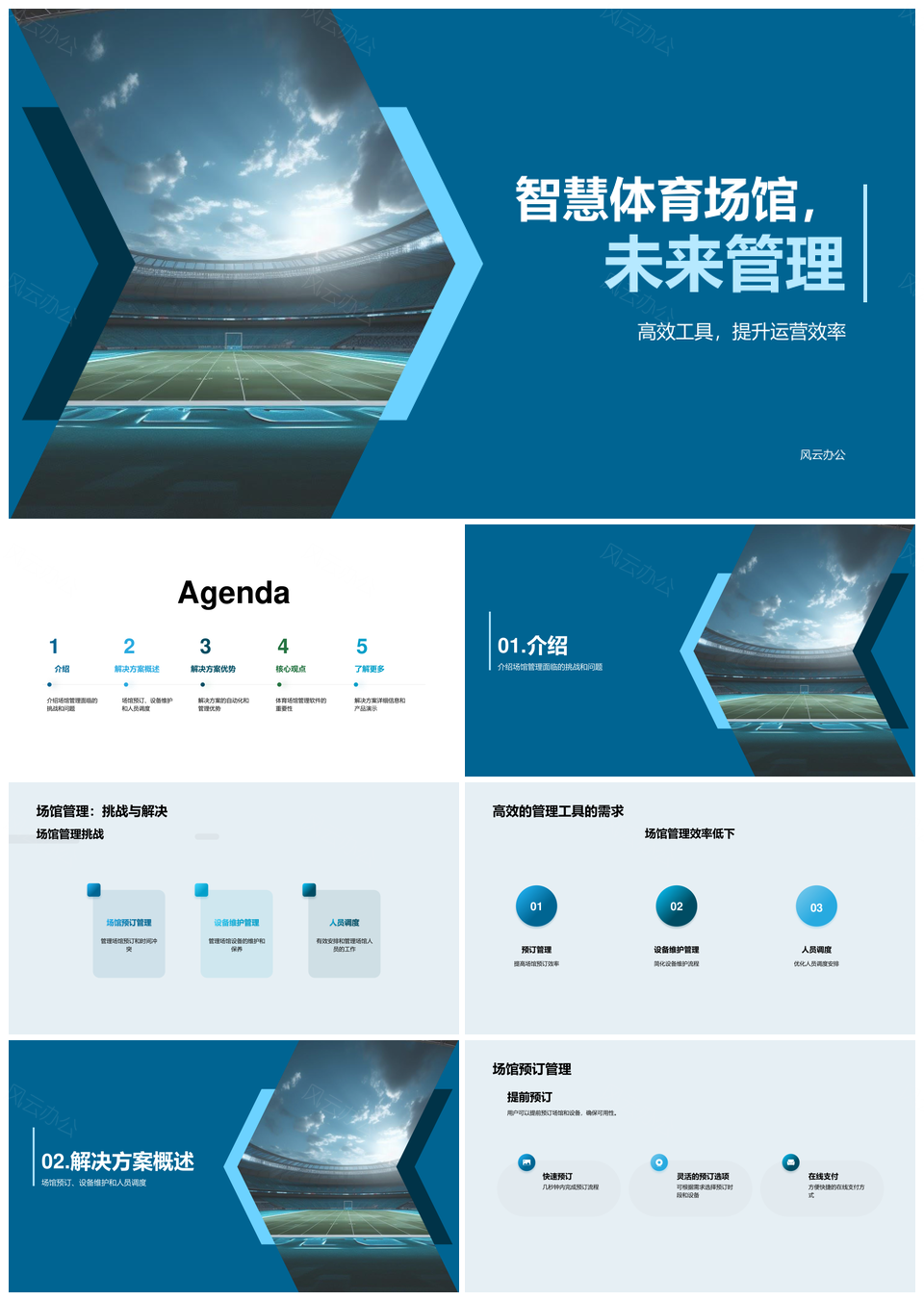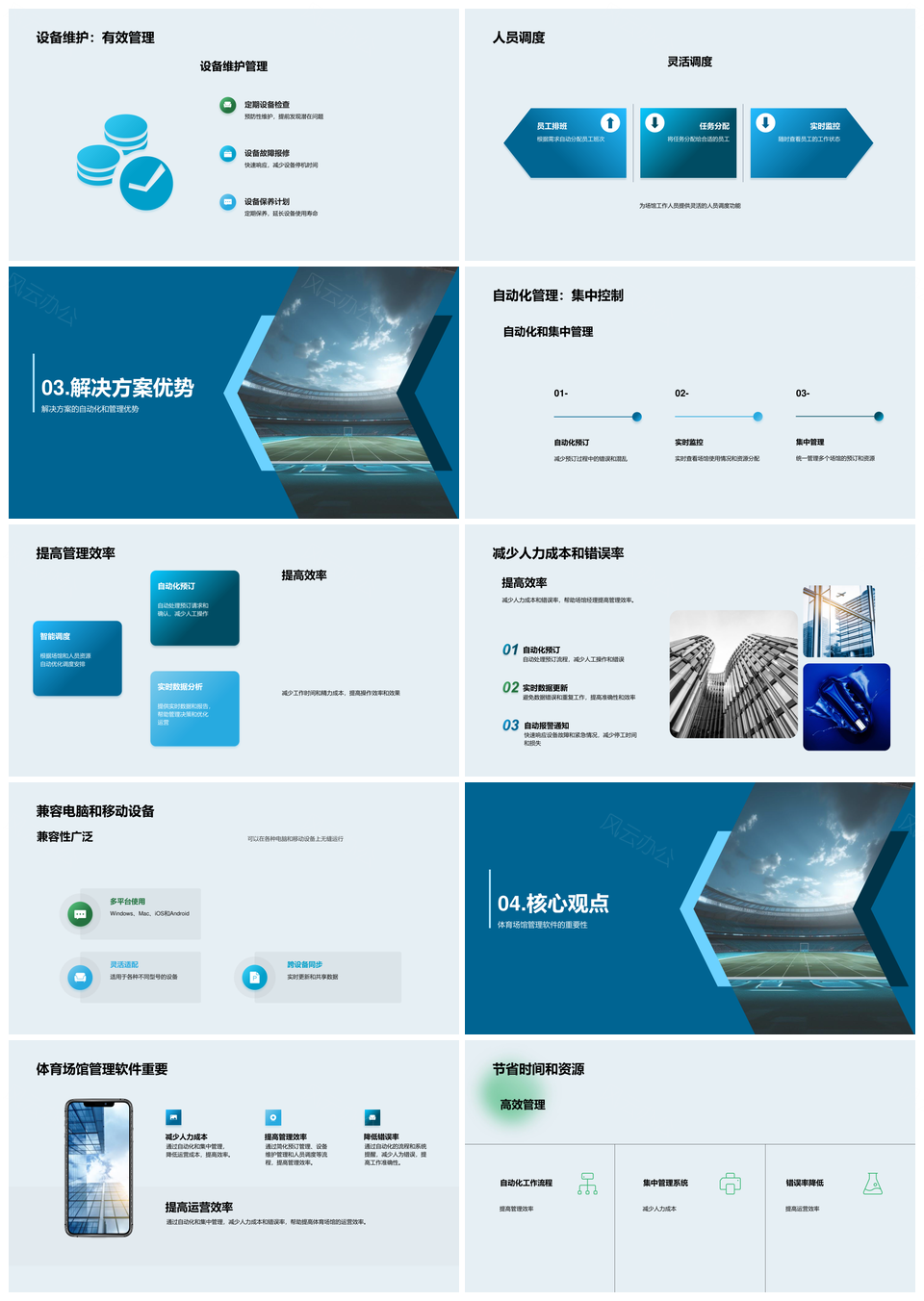 风云办公提供的智能体育场馆自动化管理提升效率PPT模板,下载格式为pptx,一共23页,作品中文字及图均可以修改和编辑,图片更改请在作品中右键图片并更换,文字修改请直接点击文字进行修改。