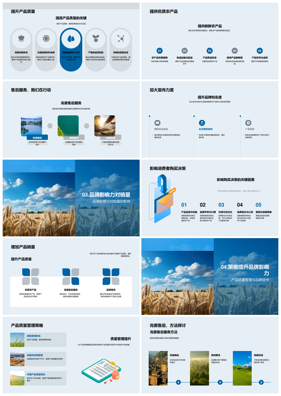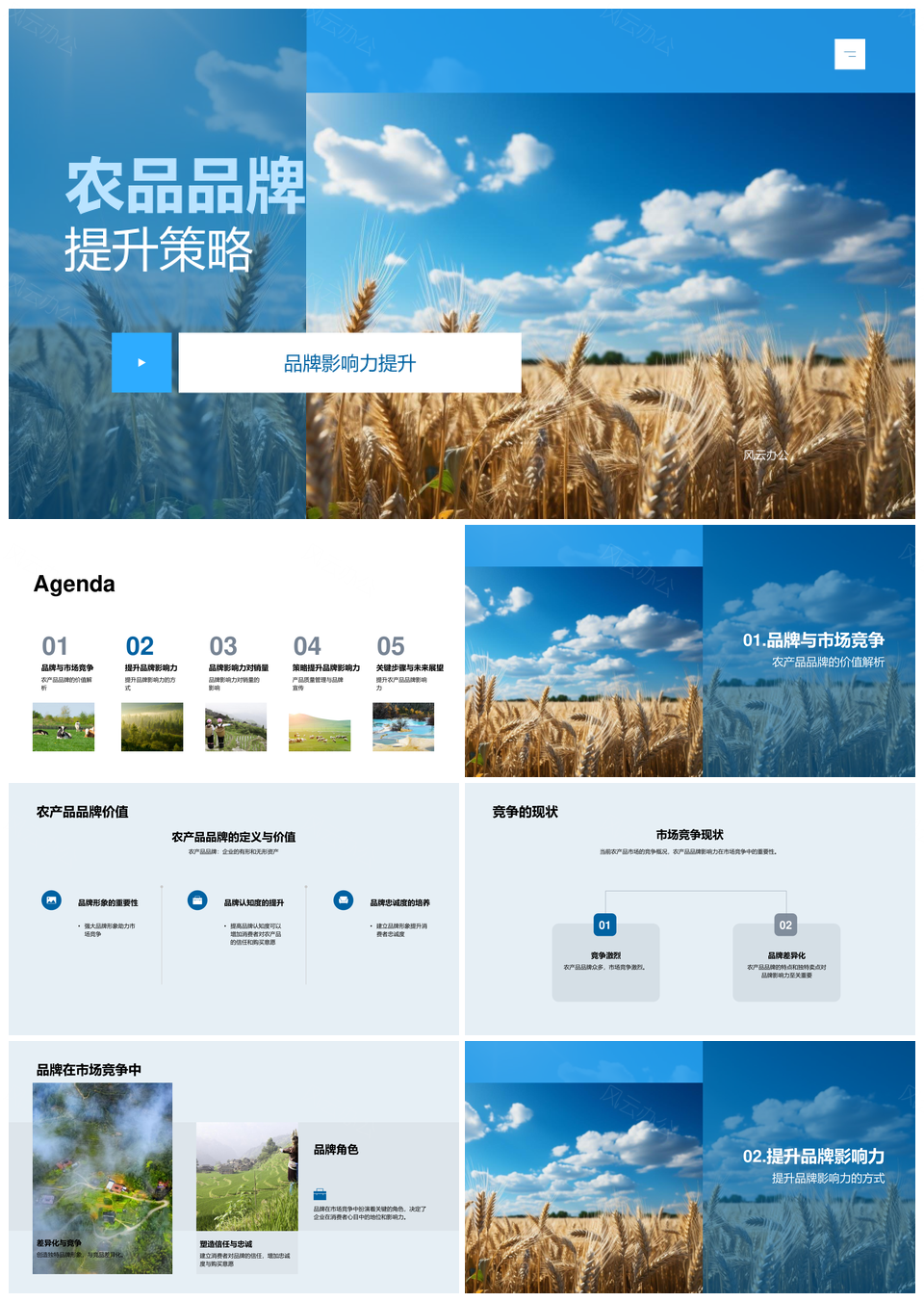 风云办公提供的农品品牌质服优化提升市场竞争影响力PPT模板,下载格式为pptx,一共22页,作品中文字及图均可以修改和编辑,图片更改请在作品中右键图片并更换,文字修改请直接点击文字进行修改。