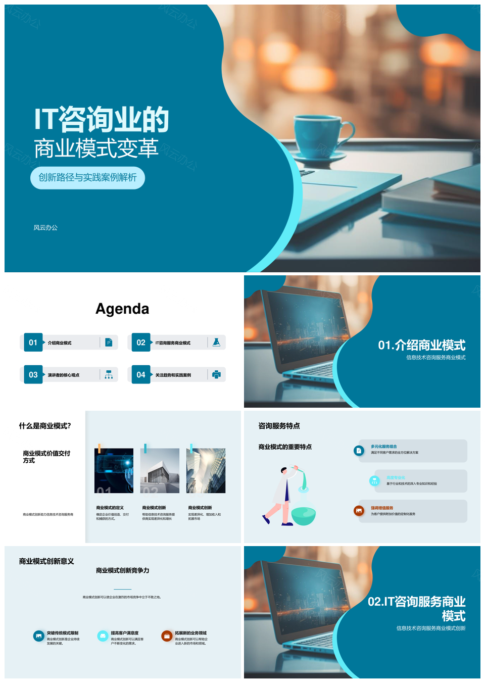 风云办公提供的信息技术咨询服务商业模式创新转型PPT模板,下载格式为pptx,一共19页,作品中文字及图均可以修改和编辑,图片更改请在作品中右键图片并更换,文字修改请直接点击文字进行修改。