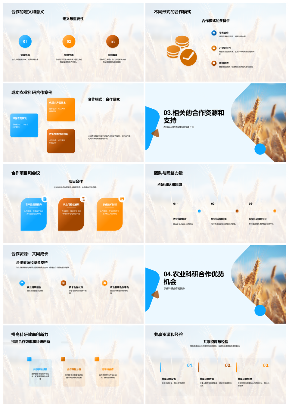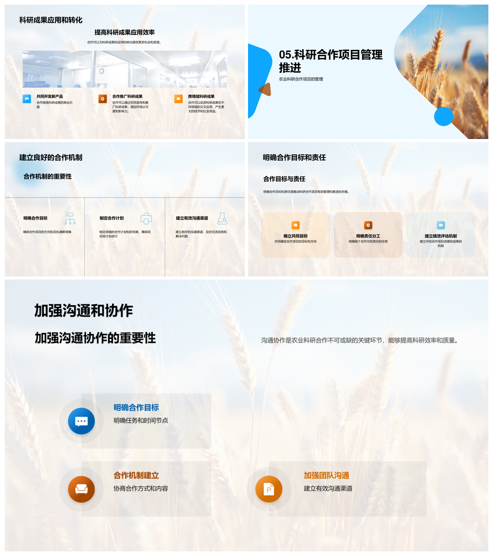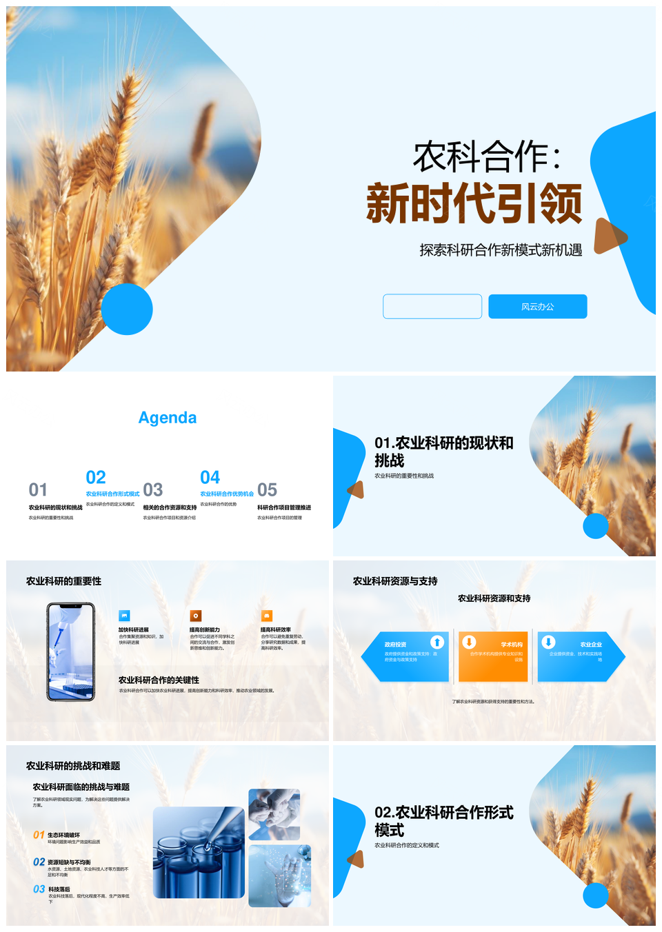 风云办公提供的农业科研合作模式破解麦田资源难题PPT模板,下载格式为pptx,一共23页,作品中文字及图均可以修改和编辑,图片更改请在作品中右键图片并更换,文字修改请直接点击文字进行修改。