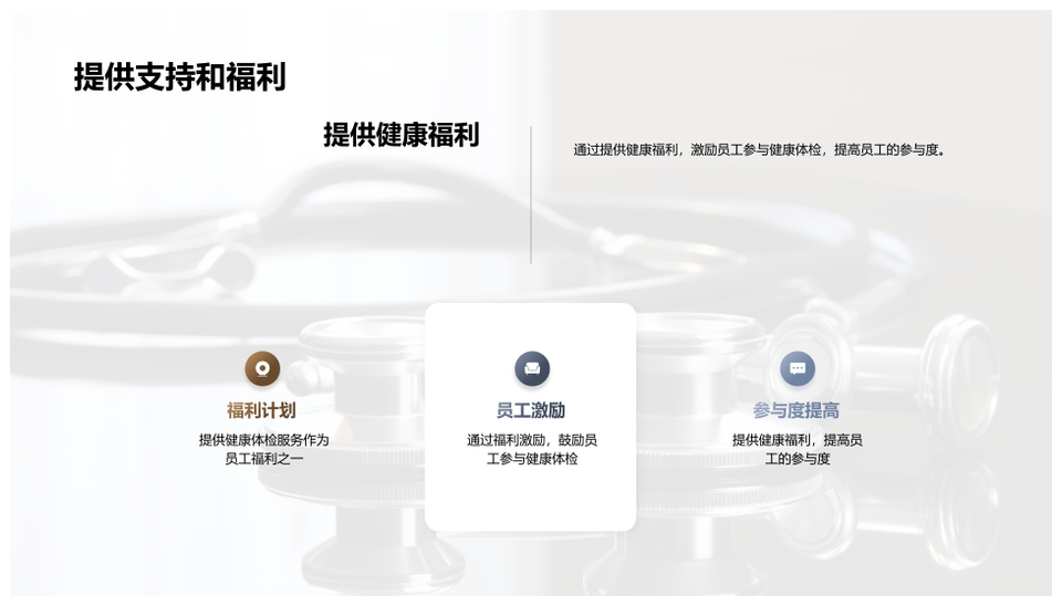 这是一张员工健康体检助力企业高效生产PPT模板,包含员工、健康体检、助力、企业、高效生产等主题内容,也可用作员工健康体检助力企业高效生产、健康体检助力企业高效生产、员工健康体检助力企业、健康体检助力企业高效、体检助力企业高效生产、员工健康体检助力、健康体检助力企业、体检助力企业高效、助力企业高效生产、员工健康体检、健康体检助力、体检助力企业、企业高效生产、健康体检企业高效、助力高效生产等PPT场景使用。