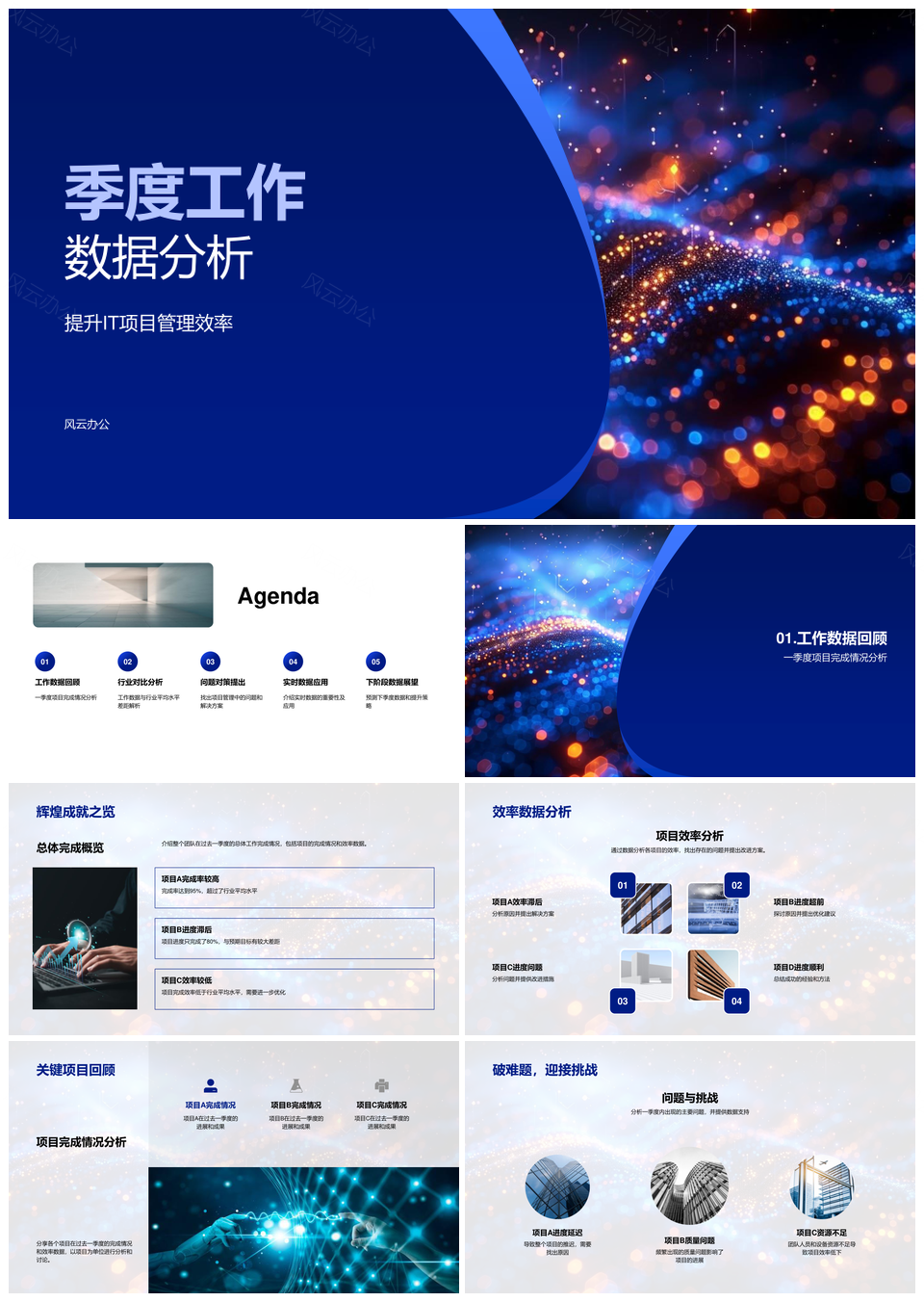 风云办公提供的IT项目管理效率季度数据驱动分析PPT模板,下载格式为pptx,一共33页,作品中文字及图均可以修改和编辑,图片更改请在作品中右键图片并更换,文字修改请直接点击文字进行修改。
