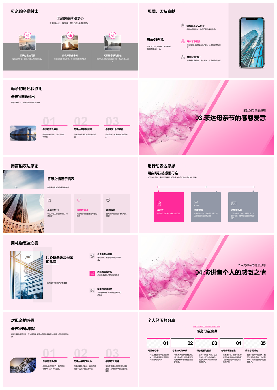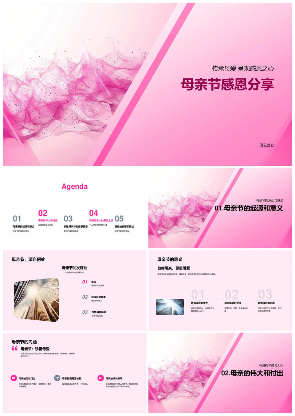 风云办公提供的母亲节感恩母爱分享珍重敬仰母亲付出PPT模板,下载格式为pptx,一共23页,作品中文字及图均可以修改和编辑,图片更改请在作品中右键图片并更换,文字修改请直接点击文字进行修改。