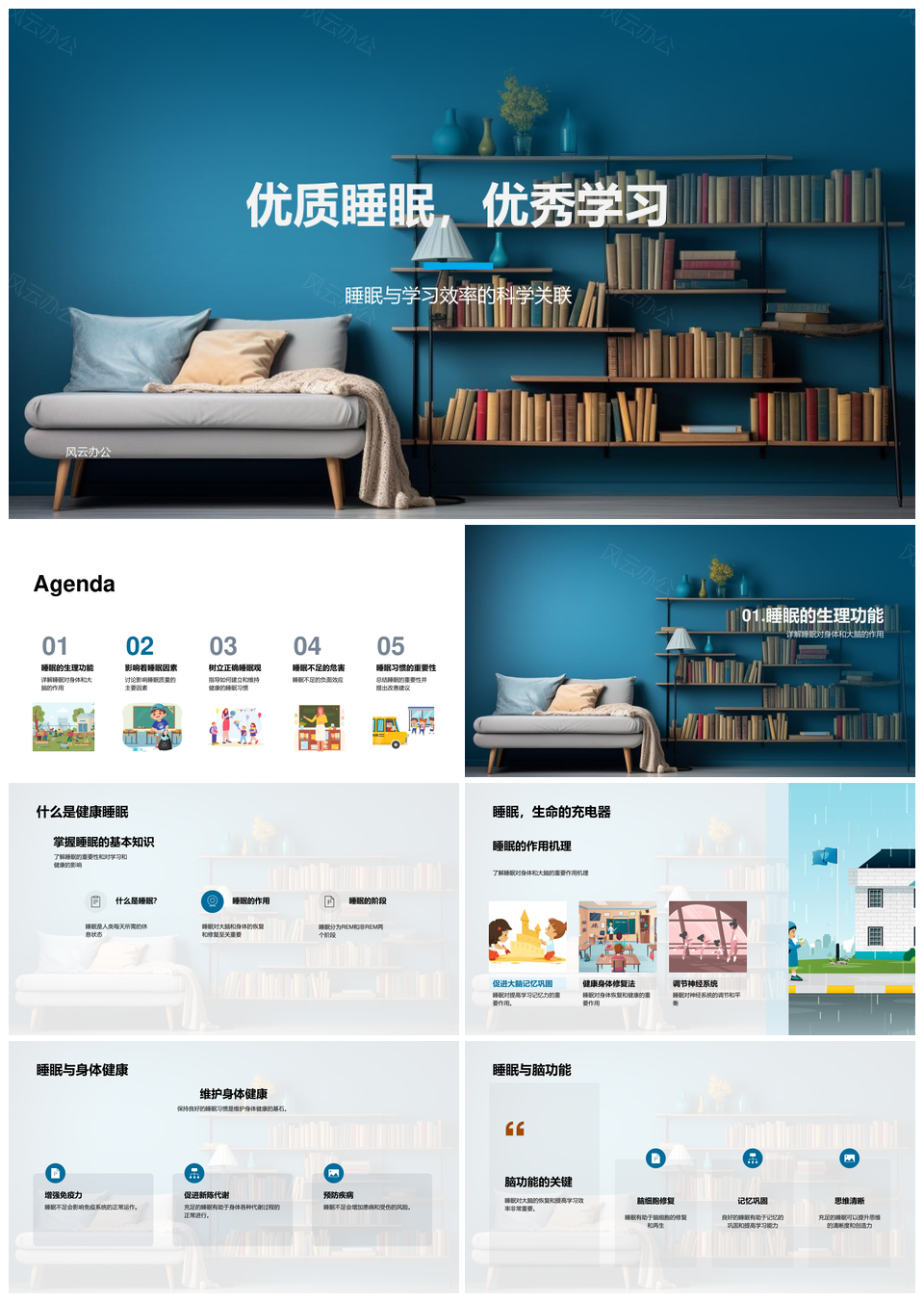 风云办公提供的优质睡眠科学关联学习效率与身心恢复PPT模板,下载格式为pptx,一共33页,作品中文字及图均可以修改和编辑,图片更改请在作品中右键图片并更换,文字修改请直接点击文字进行修改。