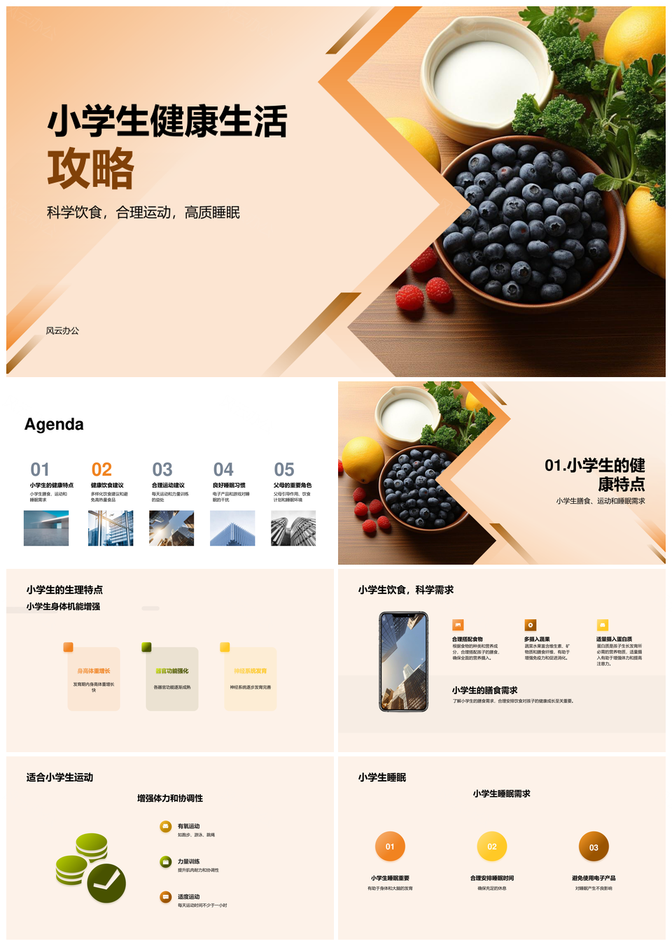 风云办公提供的小学生健康生活专家指导膳食运动睡眠PPT模板,下载格式为pptx,一共26页,作品中文字及图均可以修改和编辑,图片更改请在作品中右键图片并更换,文字修改请直接点击文字进行修改。