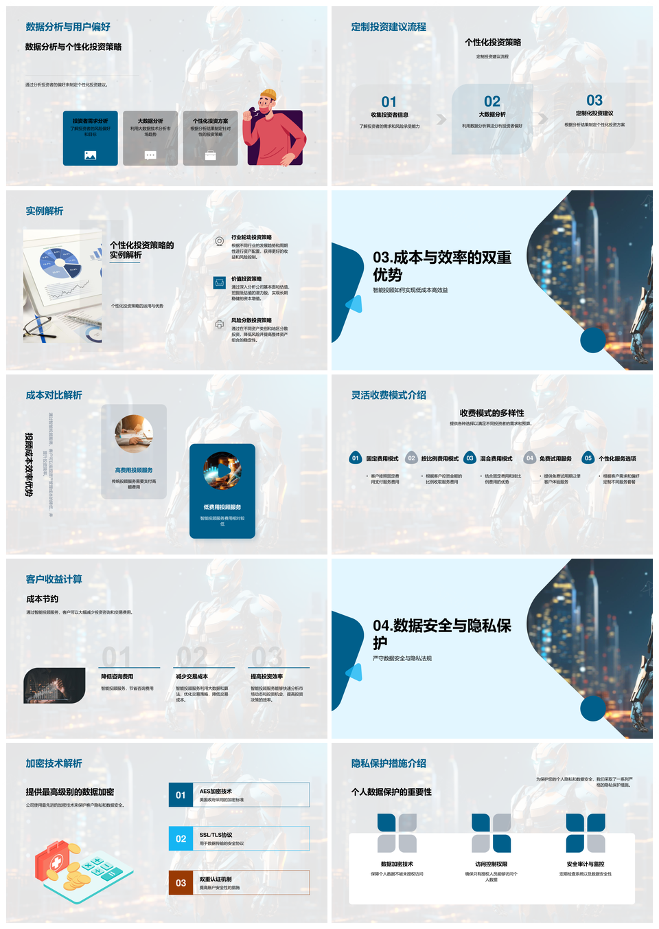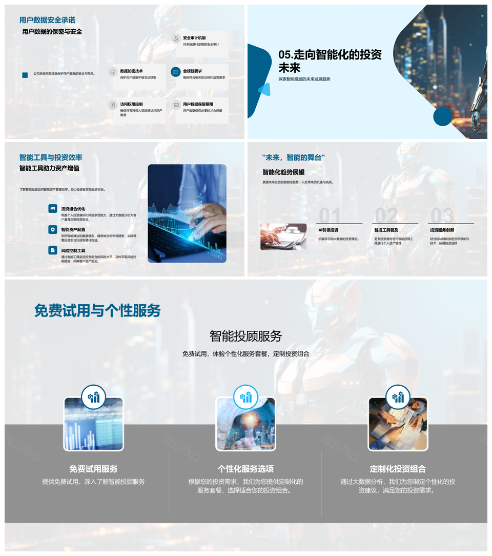 这是一张智能投顾解析投资大数据定制建议收费成本加密人工智能PPT模板,包含智能投顾、解析、投资、大数据、定制、建议、收费、成本、加密、人工智能等主题内容,也可用作智能投顾解析投资大数据、解析投资大数据定制、投资大数据定制建议、大数据定制建议收费、定制建议收费成本、建议收费成本加密、收费成本加密人工智能、智能投顾解析投资、解析投资大数据、投资大数据定制、大数据定制建议、定制建议收费、建议收费成本、收费成本加密、成本加密人工智能等PPT场景使用。 风云办公提供的智能投顾解析投资大数据定制建议收费成本加密人工智能PPT模板,下载格式为pptx,一共23页,作品中文字及图均可以修改和编辑,图片更改请在作品中右键图片并更换,文字修改请直接点击文字进行修改。