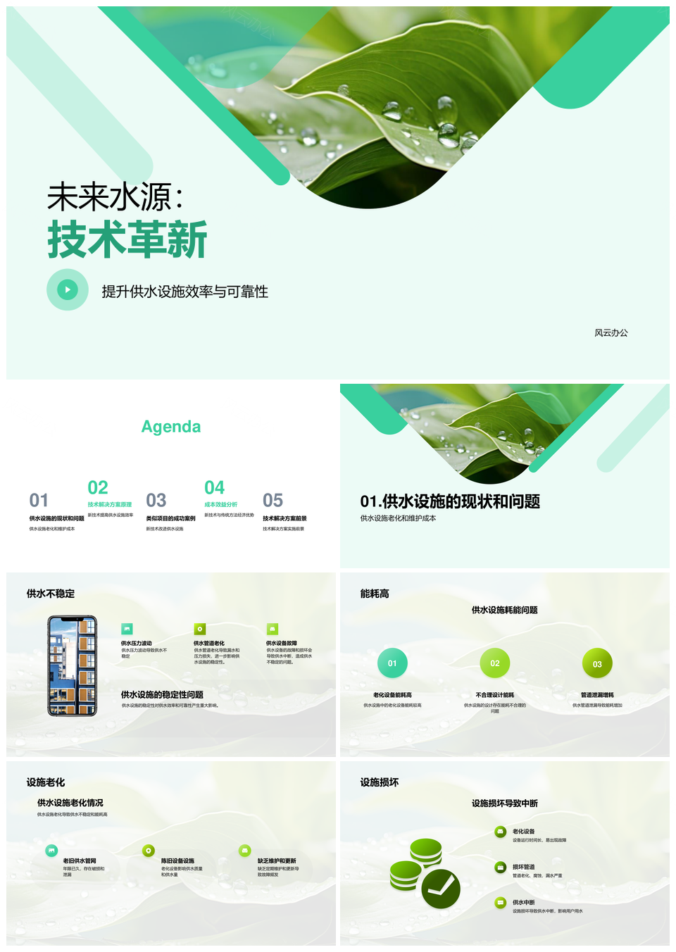 风云办公提供的老化供水设施高能耗技术革新稳水源PPT模板,下载格式为pptx,一共30页,作品中文字及图均可以修改和编辑,图片更改请在作品中右键图片并更换,文字修改请直接点击文字进行修改。