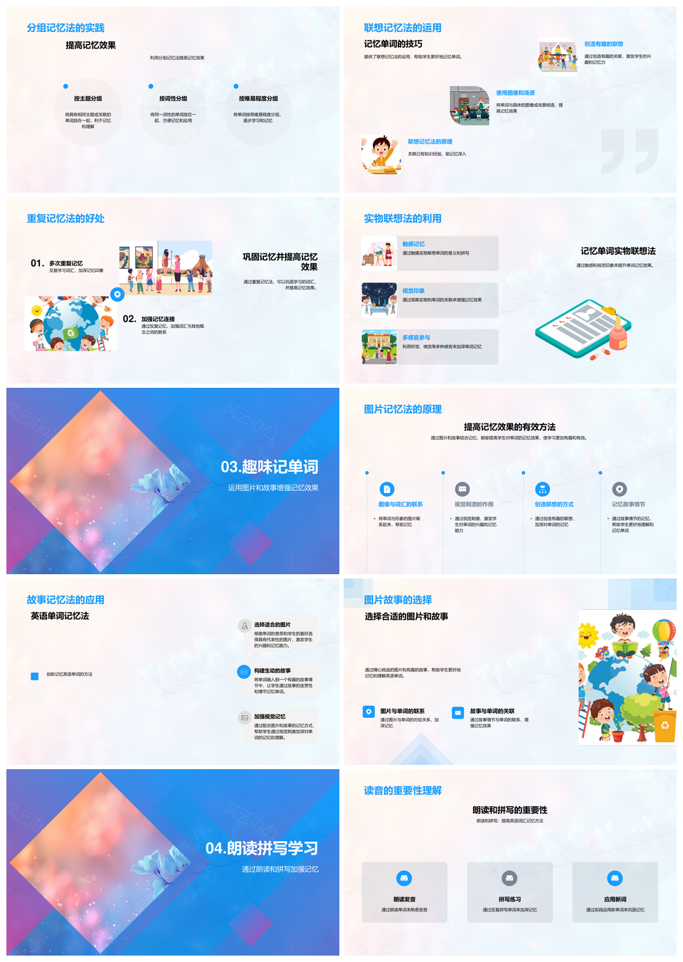 英语词汇记忆法分组联想重复实物图片故事朗读PPT模板推荐