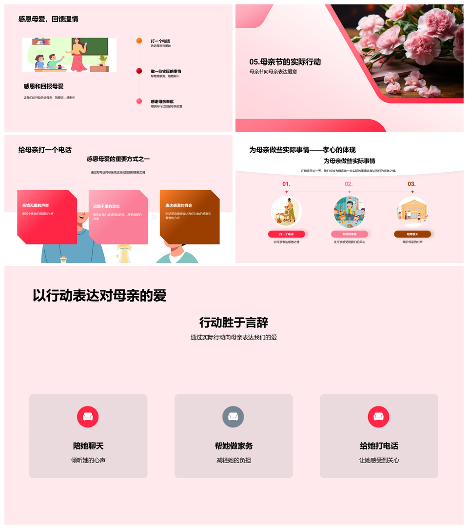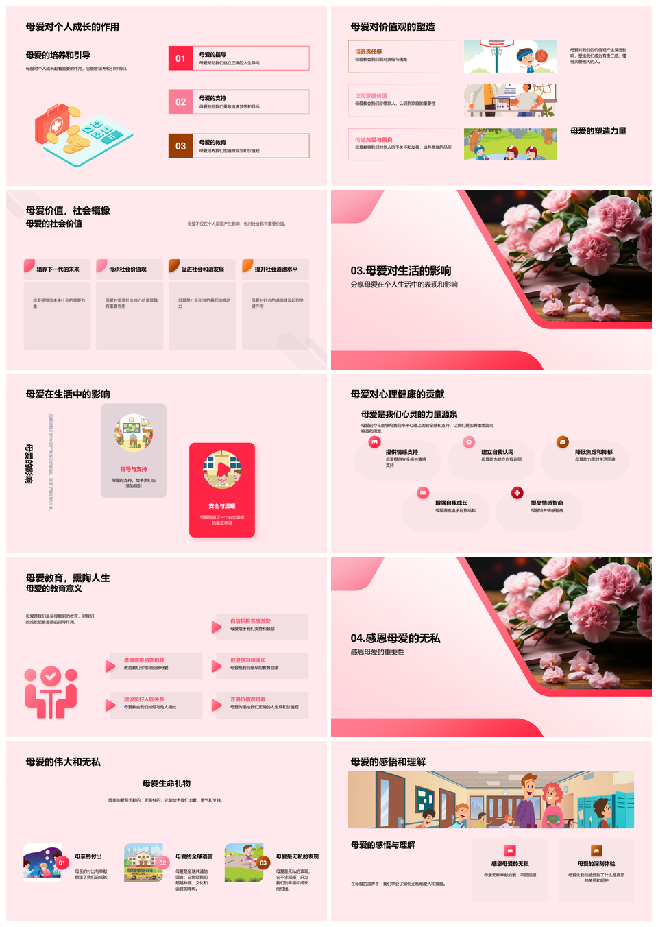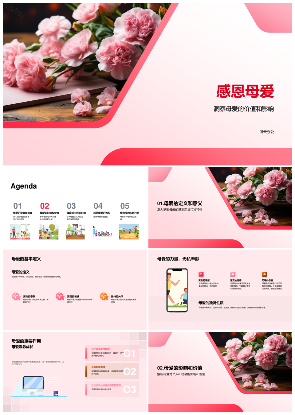 母爱价值影响母亲节家长谈教育定义发展粉康乃馨PPT模板