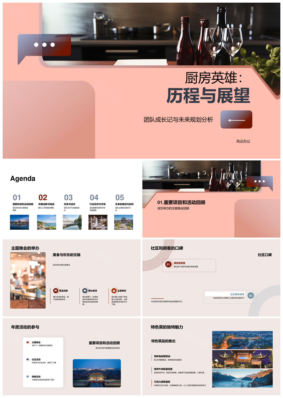 这是一张厨房英雄团队成长与未来规划晚会成就社区口碑PPT模板,包含厨房英雄、团队、成长、未来规划、晚会、成就、社区、口碑等主题内容,也可用作厨房英雄团队成长未来规划、厨房英雄团队成长晚会成就、团队成长未来规划晚会成就、未来规划晚会成就社区口碑、厨房英雄团队成长社区口碑、团队成长未来规划社区口碑、厨房英雄未来规划晚会成就、团队成长晚会成就社区口碑、厨房英雄晚会成就社区口碑、未来规划晚会成就社区口碑、厨房英雄团队成长未来、团队成长未来规划晚会、未来规划晚会成就社区、厨房英雄团队成长社区、团队成长未来社区口碑等PPT场景使用。 风云办公提供的厨房英雄团队成长与未来规划晚会成就社区口碑PPT模板,下载格式为pptx,一共33页,作品中文字及图均可以修改和编辑,图片更改请在作品中右键图片并更换,文字修改请直接点击文字进行修改。