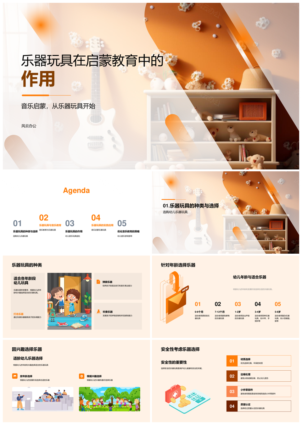 风云办公提供的乐器玩具启蒙幼儿音乐兴趣教育PPT模板,下载格式为pptx,一共33页,作品中文字及图均可以修改和编辑,图片更改请在作品中右键图片并更换,文字修改请直接点击文字进行修改。