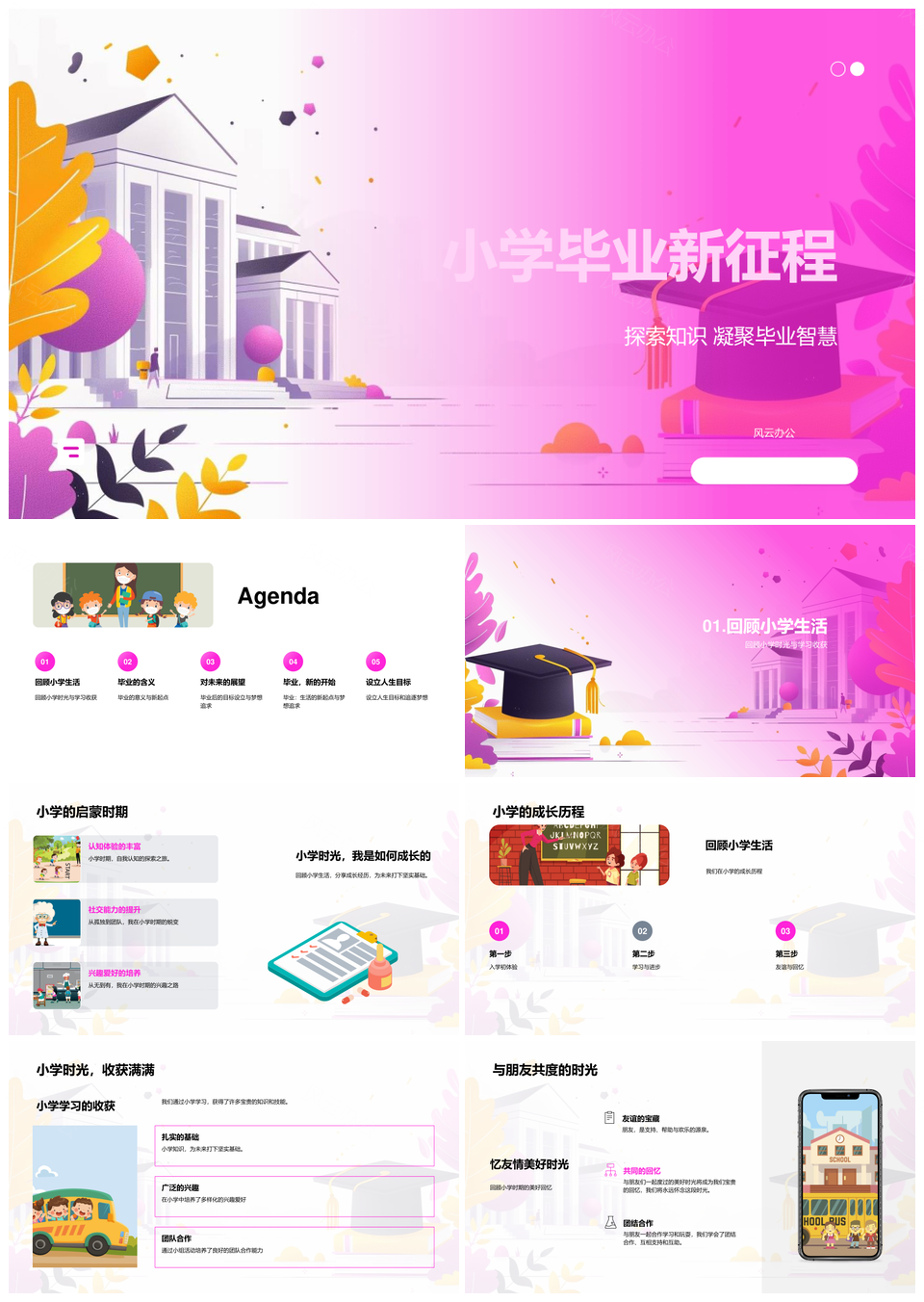 风云办公提供的小学毕业启航智慧成长人生新程PPT模板,下载格式为pptx,一共33页,作品中文字及图均可以修改和编辑,图片更改请在作品中右键图片并更换,文字修改请直接点击文字进行修改。