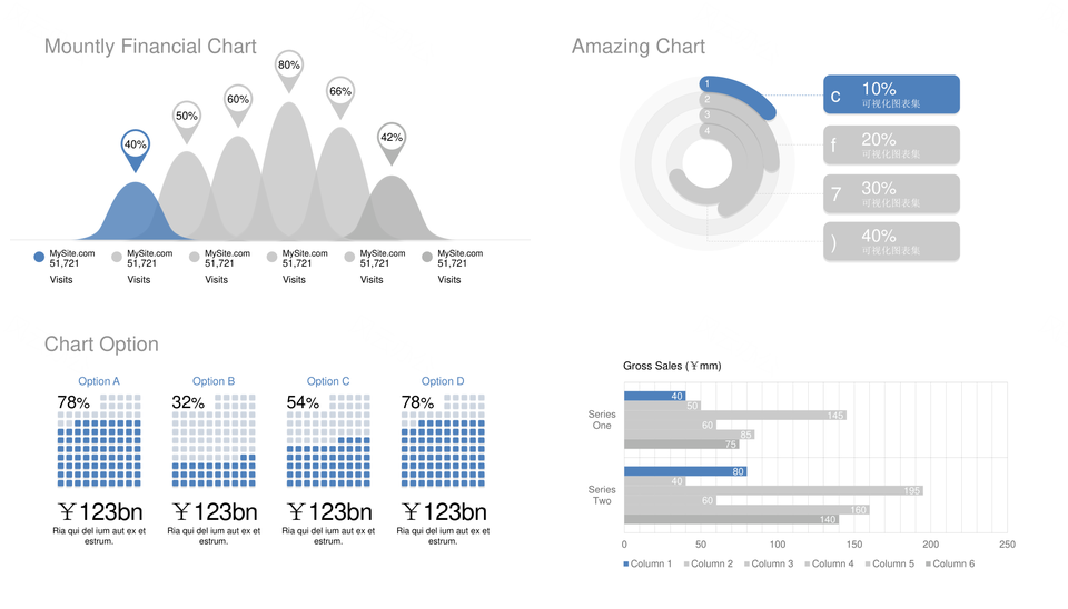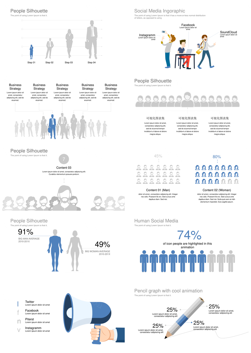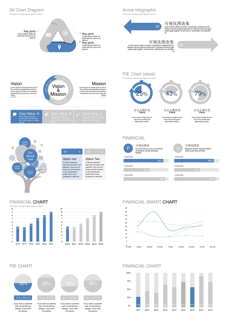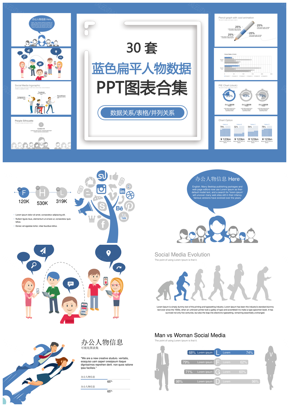 蓝色扁平人物数据数据关系表格并列关系PPT图表合集推荐
