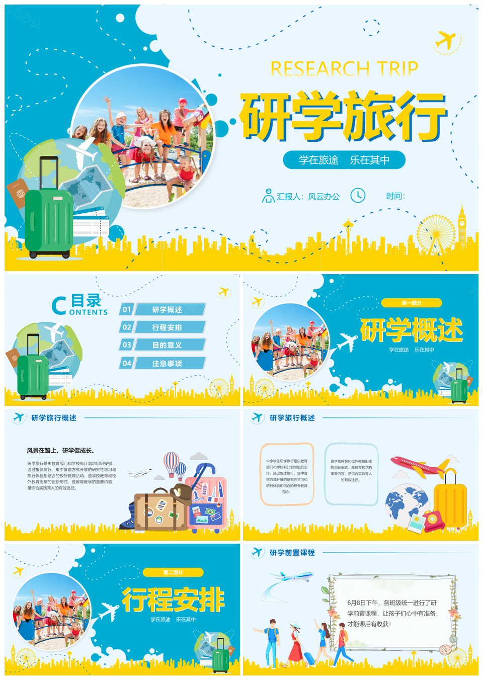 风云办公提供的2025蓝黄实拍插画研学旅行教育PPT模板,下载格式为pptx,一共21页,作品中文字及图均可以修改和编辑,图片更改请在作品中右键图片并更换,文字修改请直接点击文字进行修改。