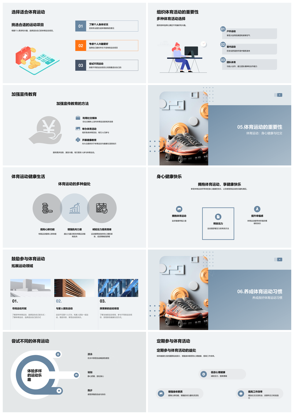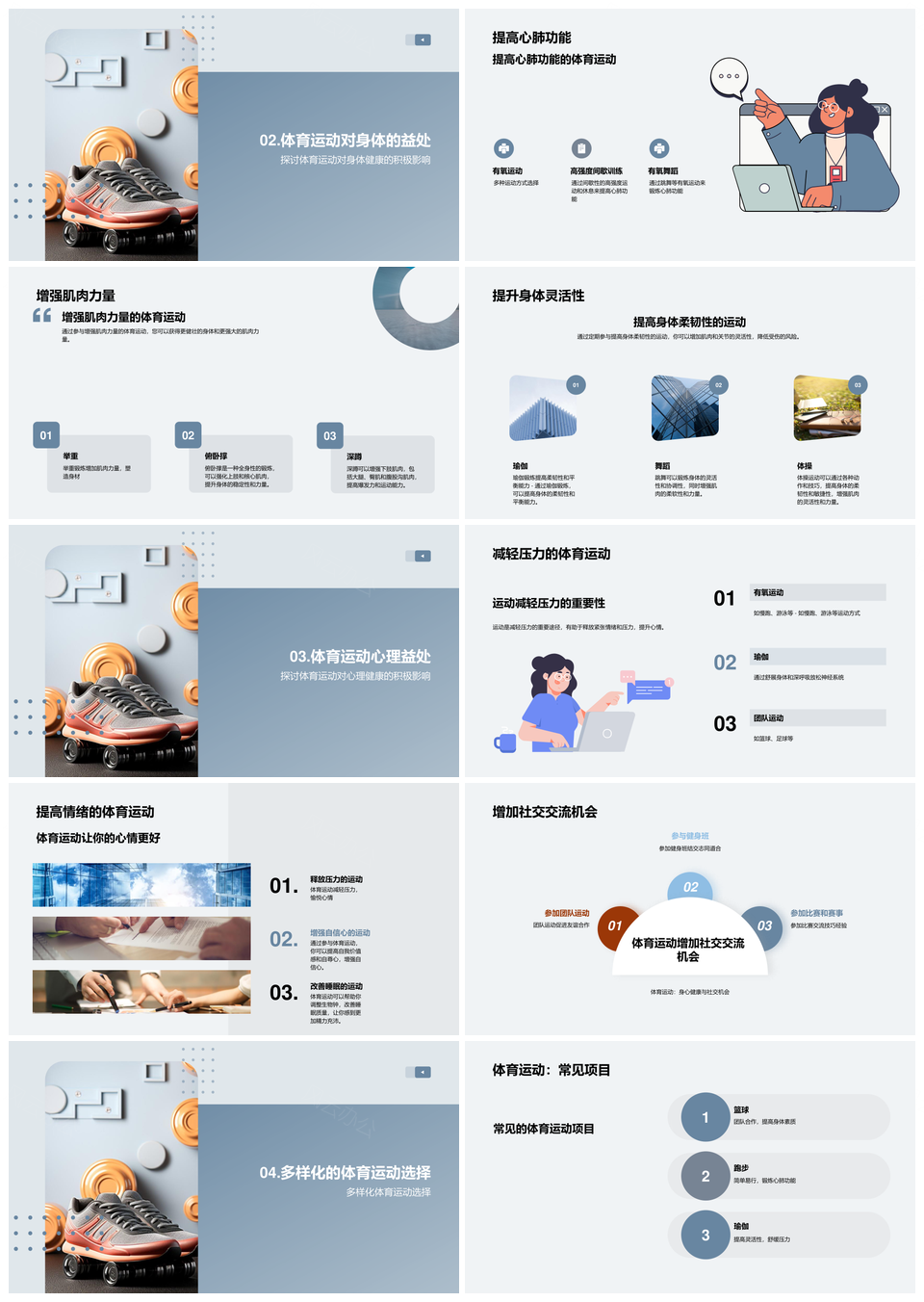 这是一张体育运动强心肺增肌灵活减压筑健康生活PPT模板,包含体育运动、强心肺、增肌、灵活、减压、健康生活等主题内容,也可用作体育运动增肌灵活减压、增肌灵活减压健康生活、心肺增肌灵活减压、体育运动心肺增肌、心肺增肌灵活、增肌灵活减压、灵活减压健康生活、体育运动增肌灵活、体育运动灵活减压、体育运动减压健康生活、体育运动增肌、体育运动灵活、体育运动减压、体育运动健康生活、心肺增肌等PPT场景使用。 风云办公提供的体育运动强心肺增肌灵活减压筑健康生活PPT模板,下载格式为pptx,一共29页,作品中文字及图均可以修改和编辑,图片更改请在作品中右键图片并更换,文字修改请直接点击文字进行修改。