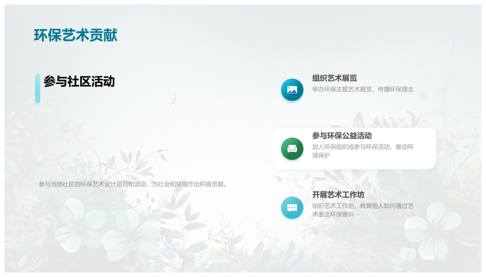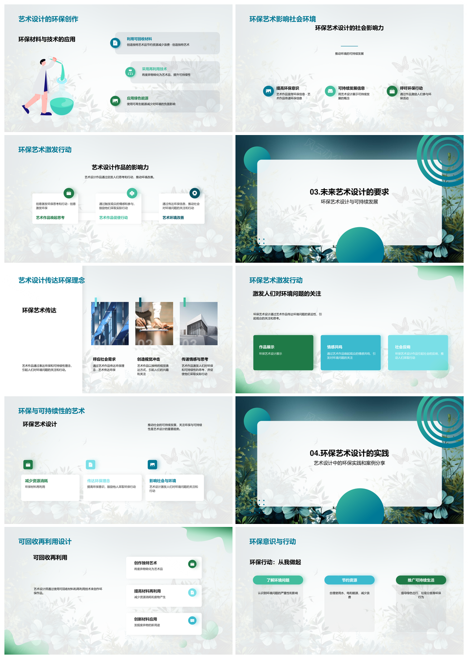 这是一张未来可持续环保艺术设计可回收材料再利用PPT模板,包含未来、可持续、环保、艺术设计、可回收材料、再利用等主题内容,也可用作未来可持续环保艺术设计、可持续环保艺术设计可回收、环保艺术设计可回收材料、艺术设计可回收材料再利用、未来可持续环保艺术设计、可持续环保可回收材料再利用、艺术设计可回收材料、可持续环保艺术设计、环保艺术可回收材料、可回收材料再利用、未来可持续环保设计、环保艺术设计可回收、艺术设计可回收、可持续环保材料再利用、环保可回收材料再利用等PPT场景使用。 风云办公提供的未来可持续环保艺术设计可回收材料再利用PPT模板,下载格式为pptx,一共19页,作品中文字及图均可以修改和编辑,图片更改请在作品中右键图片并更换,文字修改请直接点击文字进行修改。