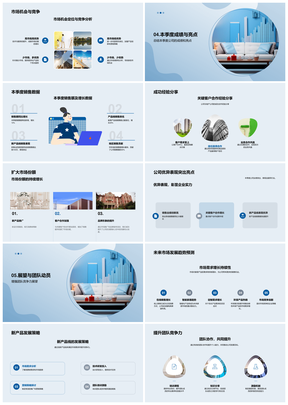 这是一张家居行业季度盘点市场趋势消费行为技术革新业绩新品PPT模板,包含家居行业、季度盘点、市场趋势、消费行为、技术革新、业绩、新品等主题内容,也可用作家居行业季度盘点、季度盘点市场趋势、市场趋势消费行为、消费行为技术革新、技术革新业绩新品、家居行业季度盘点市场、行业季度盘点市场趋势、季度盘点市场趋势消费、市场趋势消费行为技术、趋势消费行为技术革新、消费行为技术革新业绩、行为技术革新业绩新品、季度盘点市场、市场趋势消费、消费行为技术等PPT场景使用。 风云办公提供的家居行业季度盘点市场趋势消费行为技术革新业绩新品PPT模板,下载格式为pptx,一共29页,作品中文字及图均可以修改和编辑,图片更改请在作品中右键图片并更换,文字修改请直接点击文字进行修改。