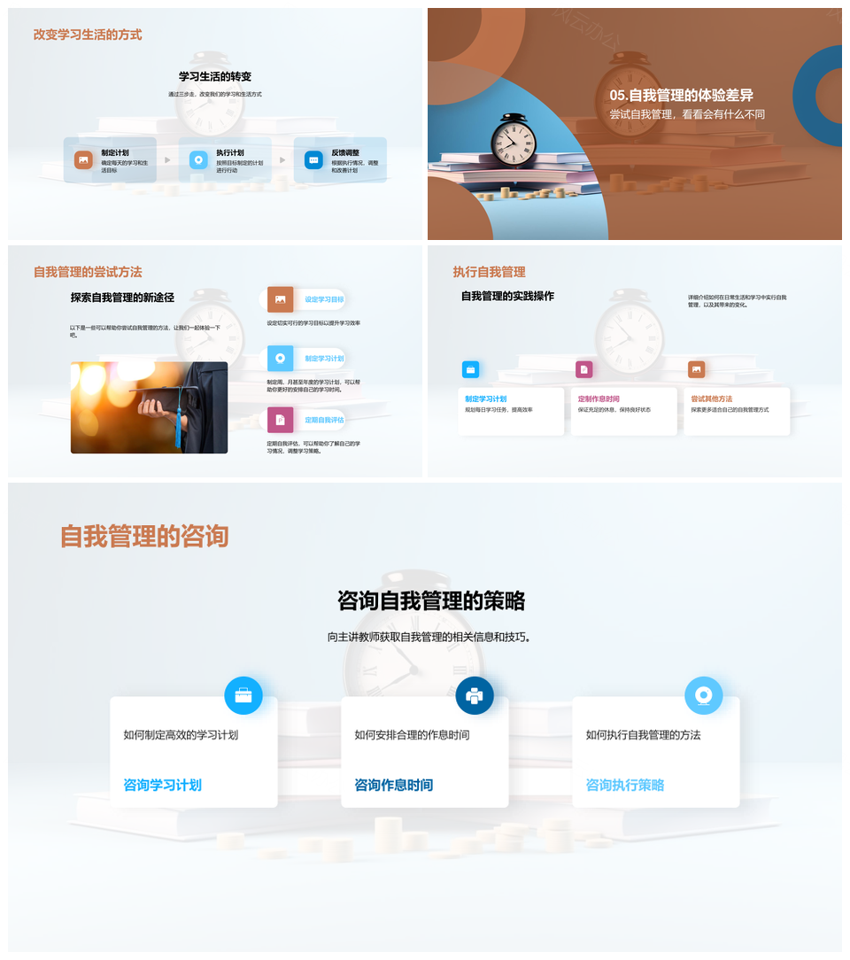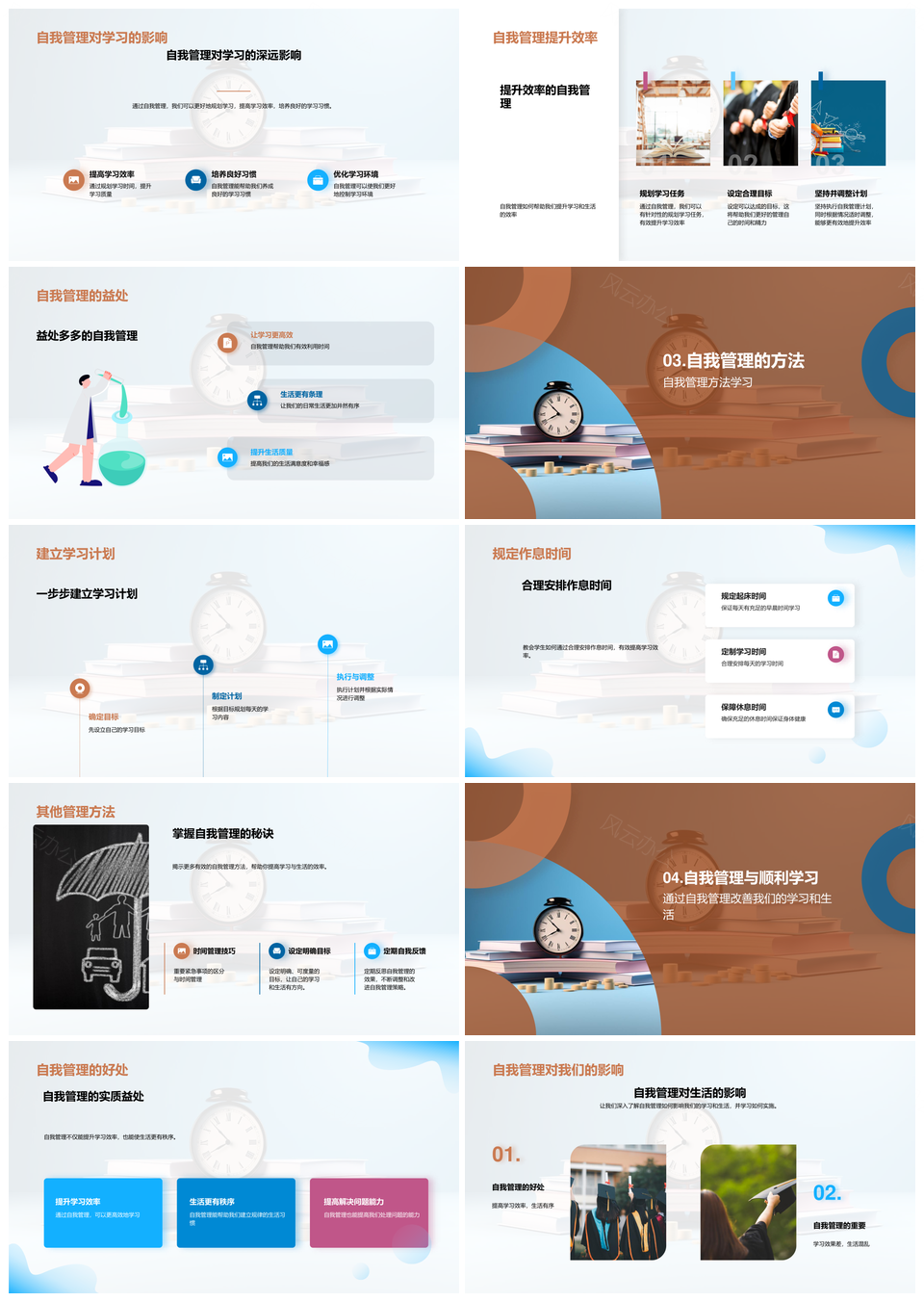 风云办公提供的自我管理优学增效促习惯计划作息PPT模板,下载格式为pptx,一共23页,作品中文字及图均可以修改和编辑,图片更改请在作品中右键图片并更换,文字修改请直接点击文字进行修改。