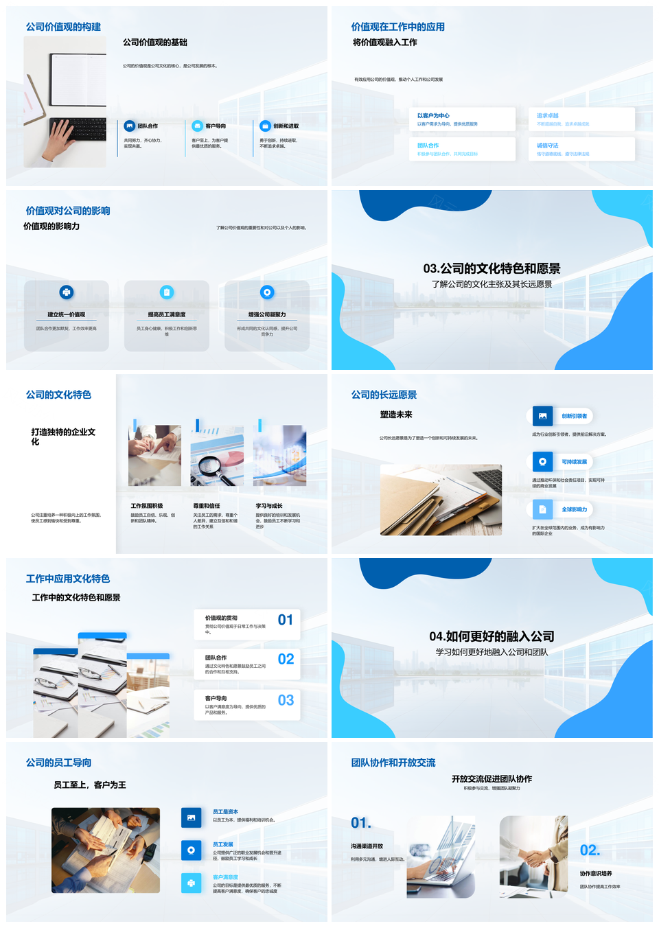 这是一张公司文化价值观引领员工融入与公司发展PPT模板,包含公司文化、价值观、引领、员工、融入、公司、发展等主题内容,也可用作公司文化价值观引领、文化价值观引领员工、价值观引领员工融入、引领员工融入公司、员工融入公司发展、公司文化价值观、文化价值观引领、价值观引领员工、引领员工融入、员工融入公司、融入公司发展、公司文化、文化价值观、引领员工、员工融入等PPT场景使用。 风云办公提供的公司文化价值观引领员工融入与公司发展PPT模板,下载格式为pptx,一共23页,作品中文字及图均可以修改和编辑,图片更改请在作品中右键图片并更换,文字修改请直接点击文字进行修改。