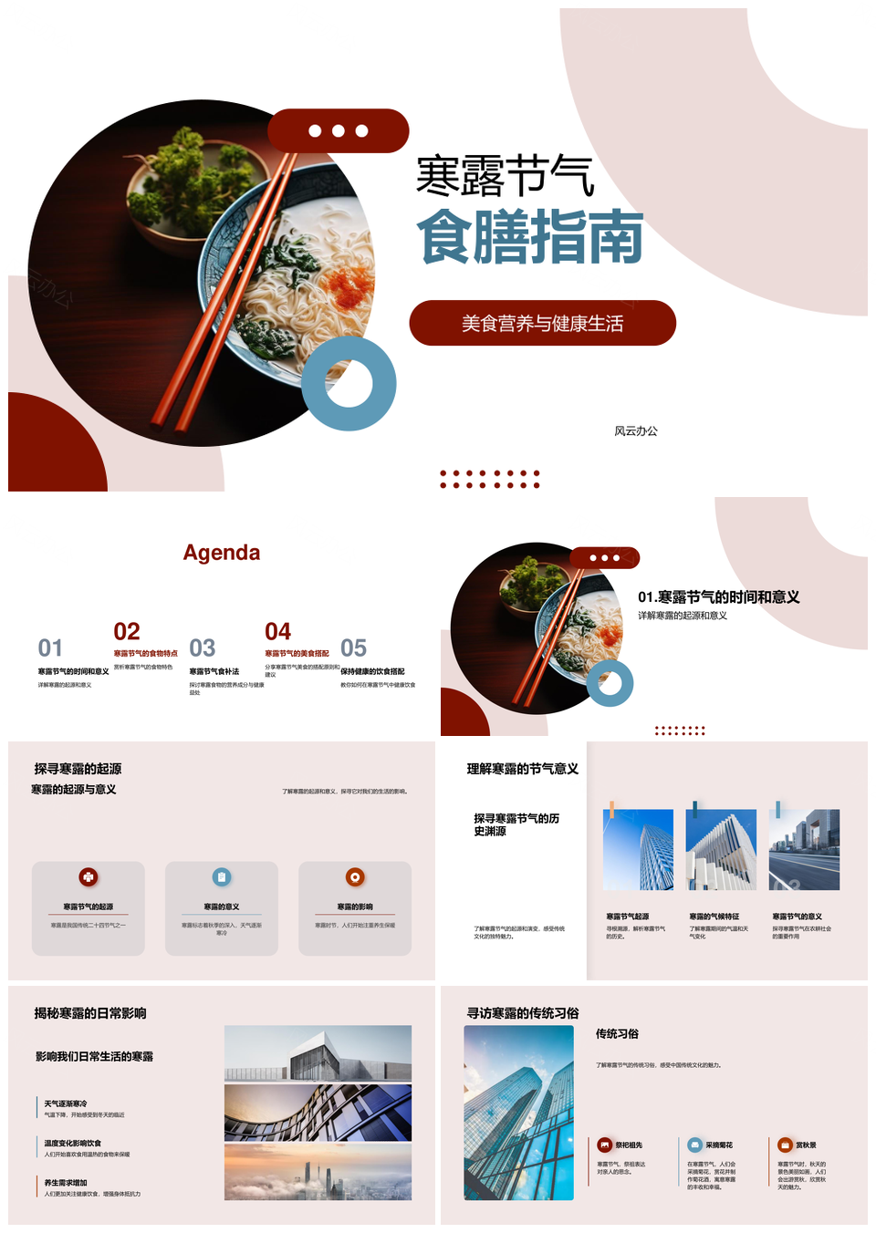 风云办公提供的寒露节气健康美食营养食膳指南PPT模板,下载格式为pptx,一共28页,作品中文字及图均可以修改和编辑,图片更改请在作品中右键图片并更换,文字修改请直接点击文字进行修改。