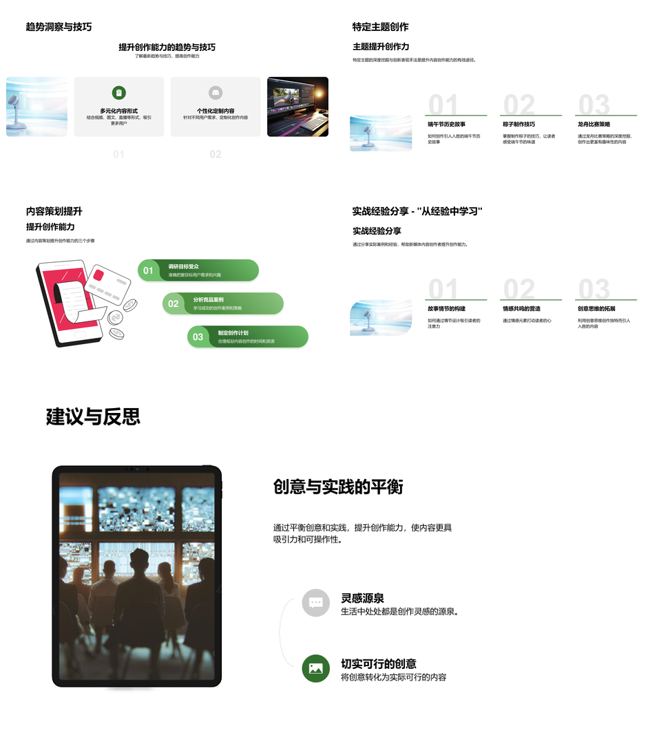 这是一张端午新媒体内容创作者PPT模板,包含端午、新媒体、内容创作者等主题内容,也可用作端午新媒体内容创作者、新媒体内容创作者、端午新媒体内容、端午新媒体创作者、端午内容创作者、新媒体内容创作、新媒体内容、端午新媒体、内容创作者、端午内容、新媒体创作者、端午创作者、内容创作、新媒体、内容等PPT场景使用。 风云办公提供的端午新媒体内容创作者PPT模板,下载格式为pptx,一共33页,作品中文字及图均可以修改和编辑,图片更改请在作品中右键图片并更换,文字修改请直接点击文字进行修改。