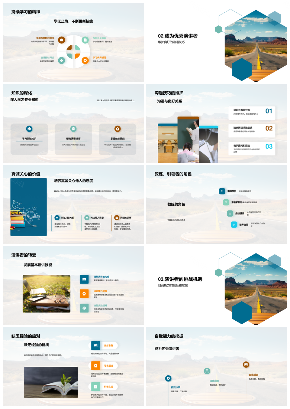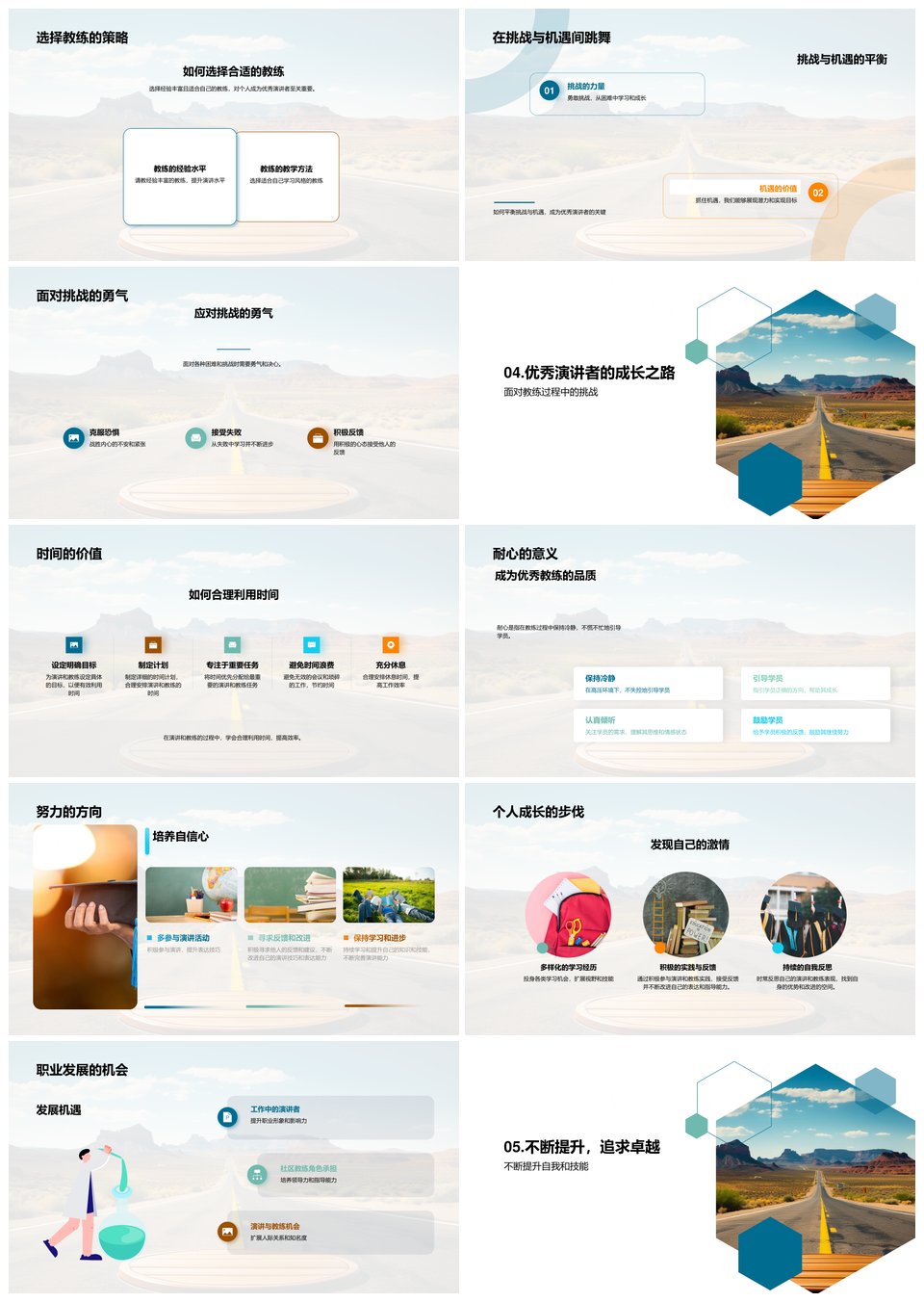 风云办公提供的演讲者之路语言体态表达沟通精进PPT模板,下载格式为pptx,一共33页,作品中文字及图均可以修改和编辑,图片更改请在作品中右键图片并更换,文字修改请直接点击文字进行修改。