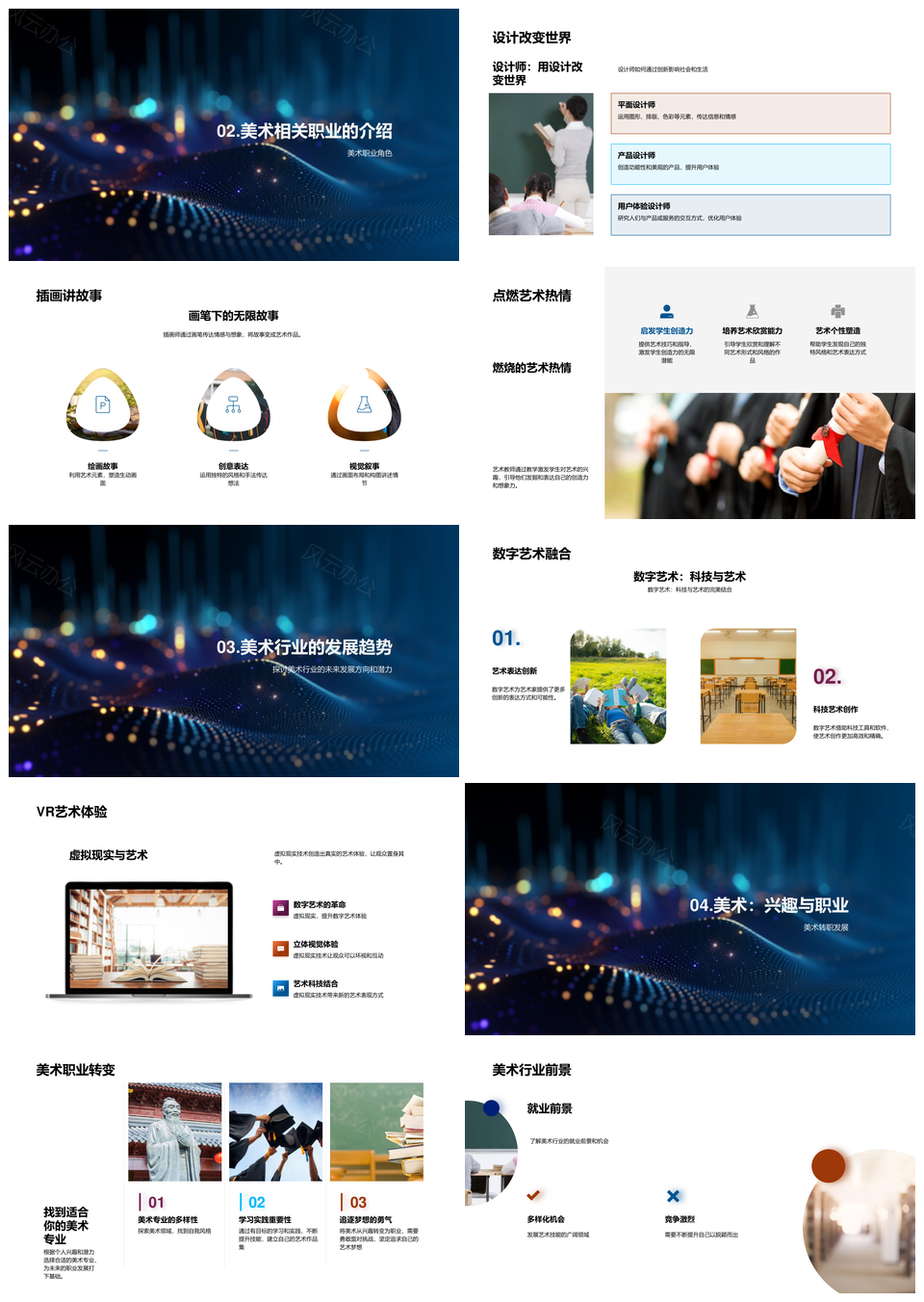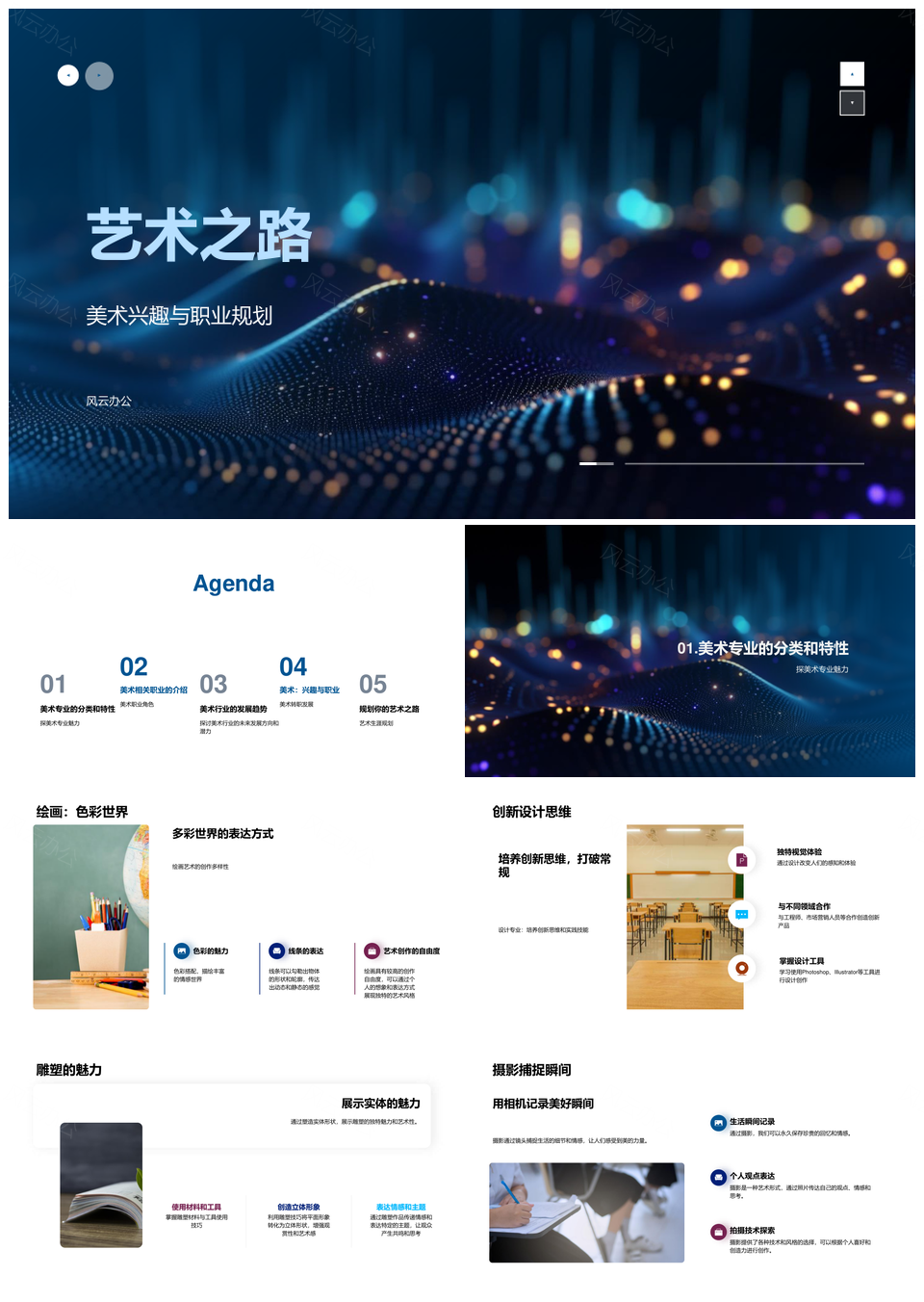 风云办公提供的美术兴趣职业规划与专业发展之路PPT模板,下载格式为pptx,一共22页,作品中文字及图均可以修改和编辑,图片更改请在作品中右键图片并更换,文字修改请直接点击文字进行修改。