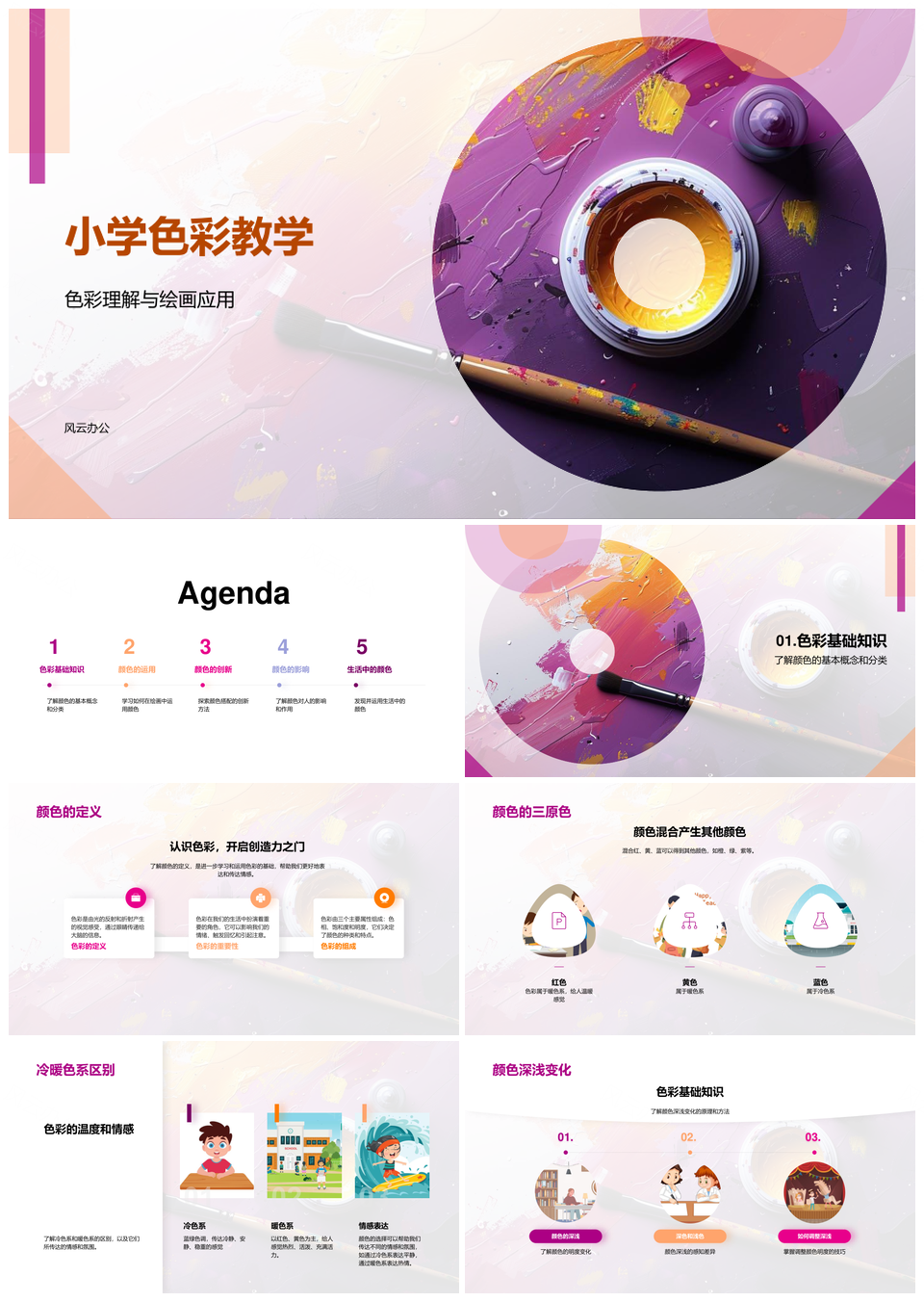 风云办公提供的小学美术色彩应用搭配理论教学PPT模板,下载格式为pptx,一共33页,作品中文字及图均可以修改和编辑,图片更改请在作品中右键图片并更换,文字修改请直接点击文字进行修改。