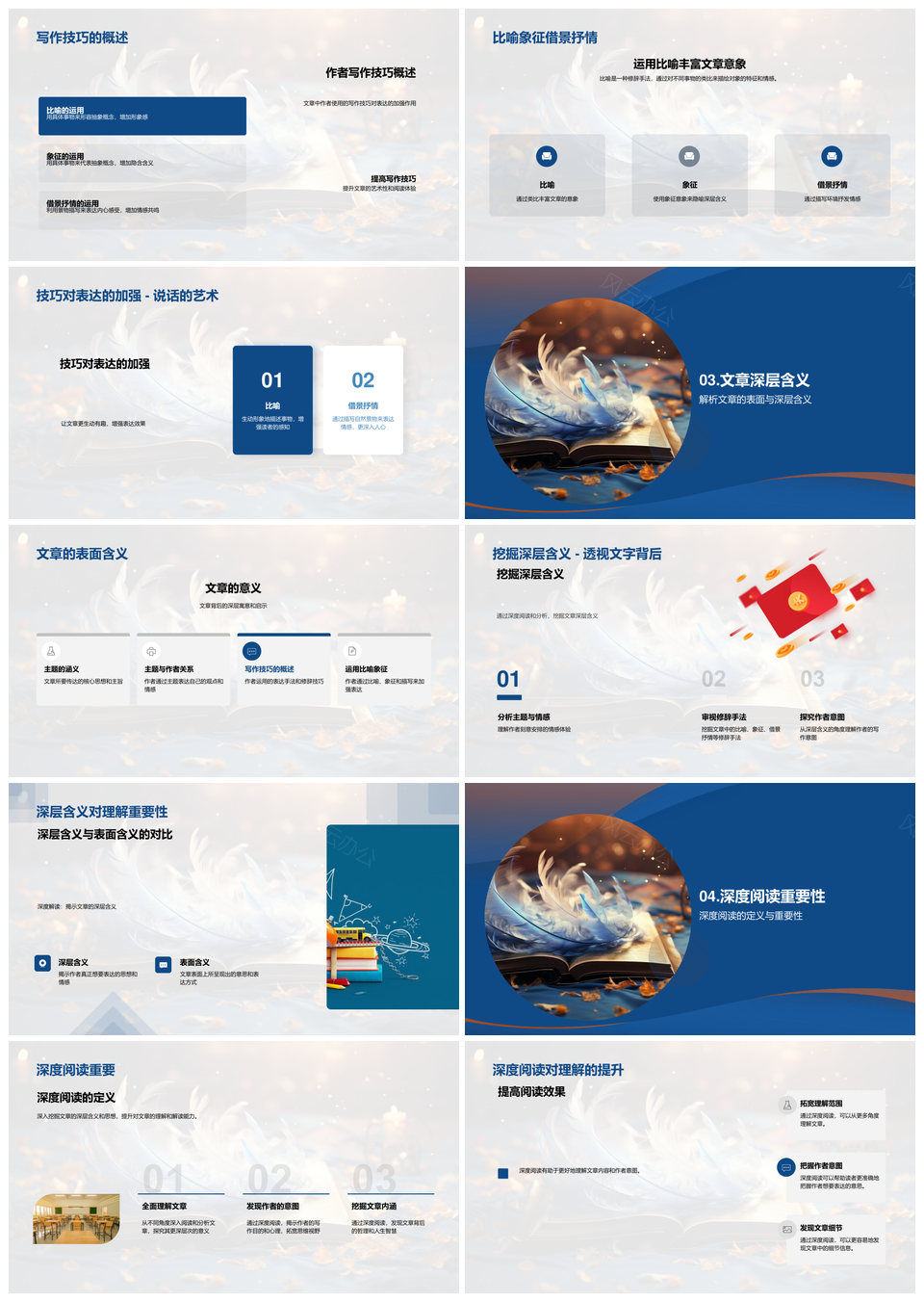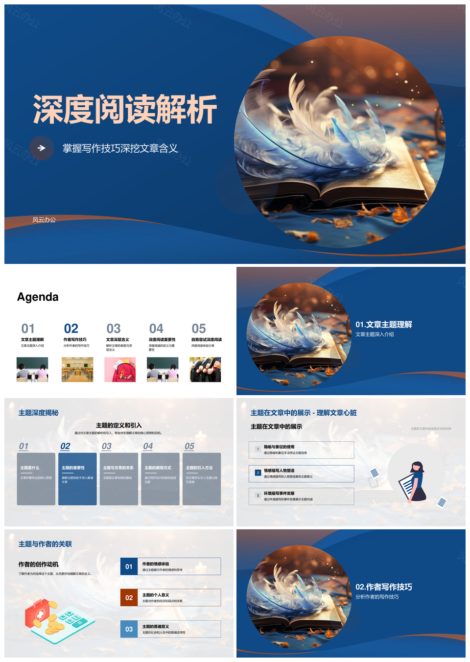 风云办公提供的深度阅读解析写作技巧主题思路PPT模板,下载格式为pptx,一共23页,作品中文字及图均可以修改和编辑,图片更改请在作品中右键图片并更换,文字修改请直接点击文字进行修改。