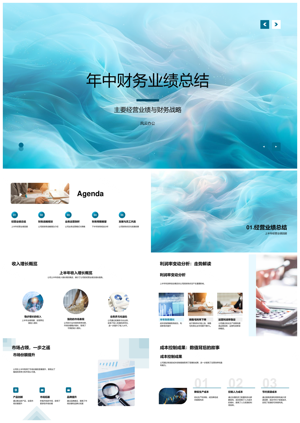 风云办公提供的年中财务战略与经营业绩总结PPT模板,下载格式为pptx,一共33页,作品中文字及图均可以修改和编辑,图片更改请在作品中右键图片并更换,文字修改请直接点击文字进行修改。