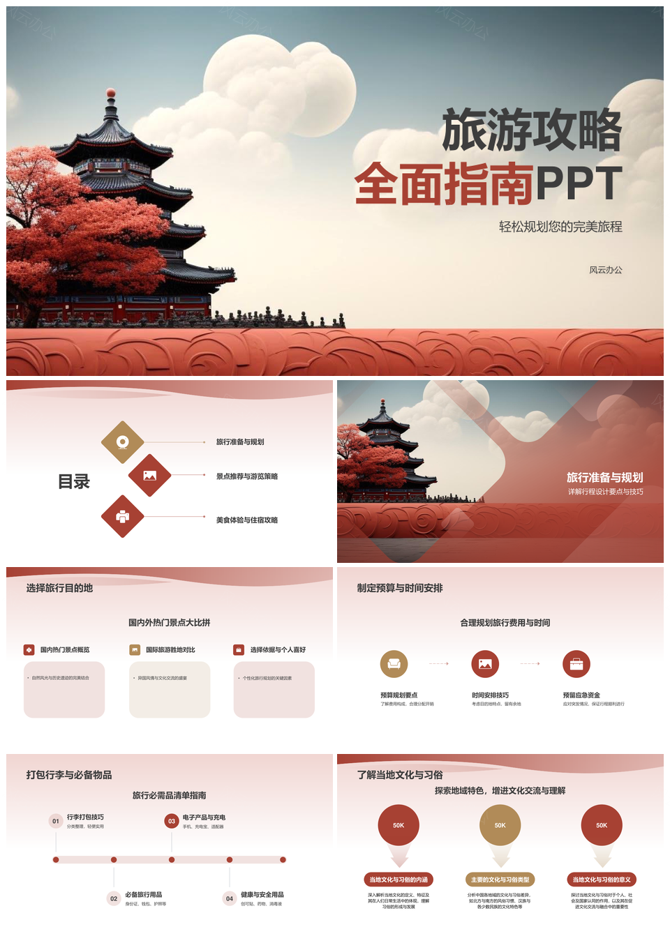 风云办公提供的红色国风商务旅游营销攻略指南PPT模板,下载格式为pptx,一共18页,作品中文字及图均可以修改和编辑,图片更改请在作品中右键图片并更换,文字修改请直接点击文字进行修改。