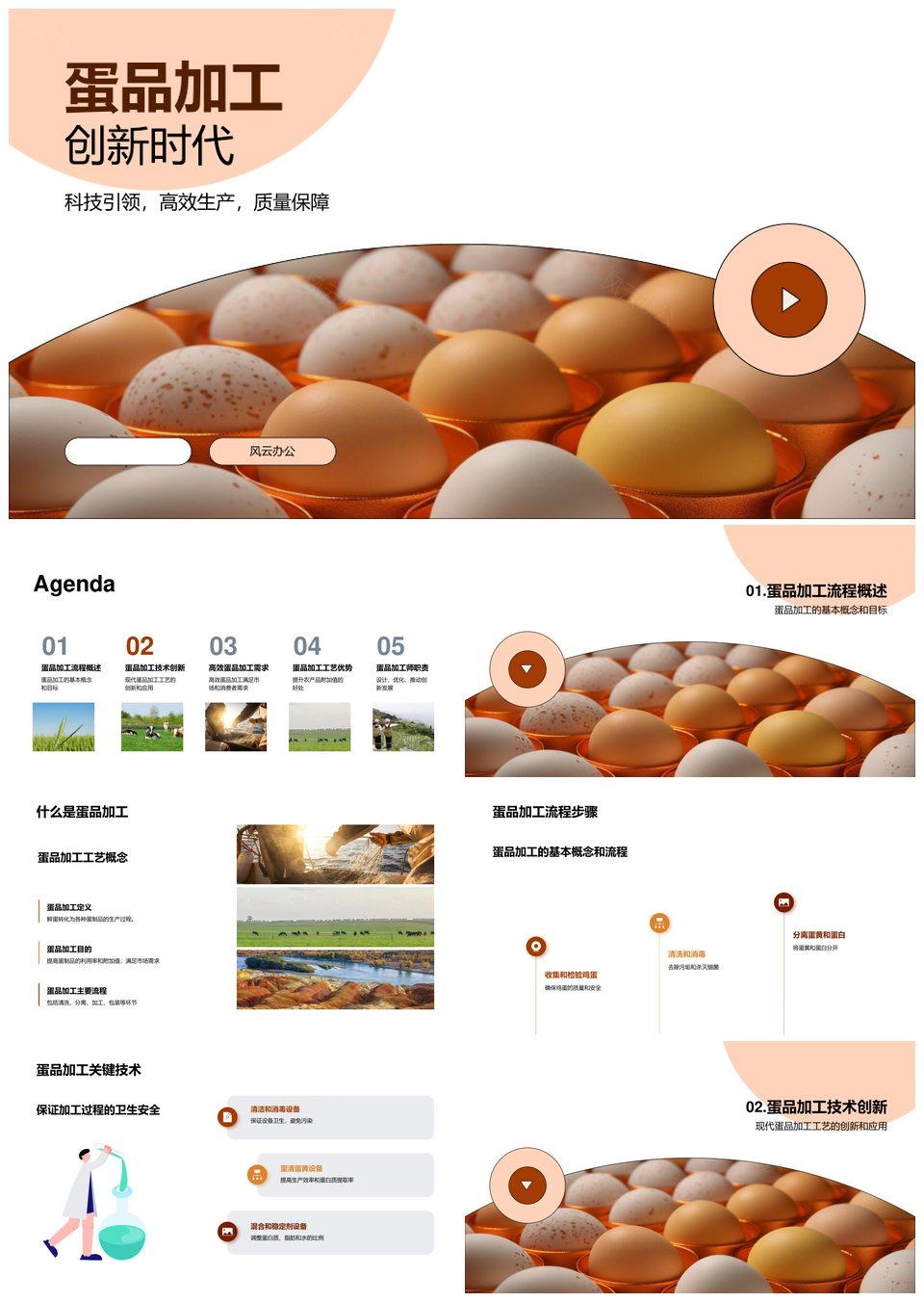 风云办公提供的高效现代蛋品加工工艺设备创新PPT模板,下载格式为pptx,一共22页,作品中文字及图均可以修改和编辑,图片更改请在作品中右键图片并更换,文字修改请直接点击文字进行修改。