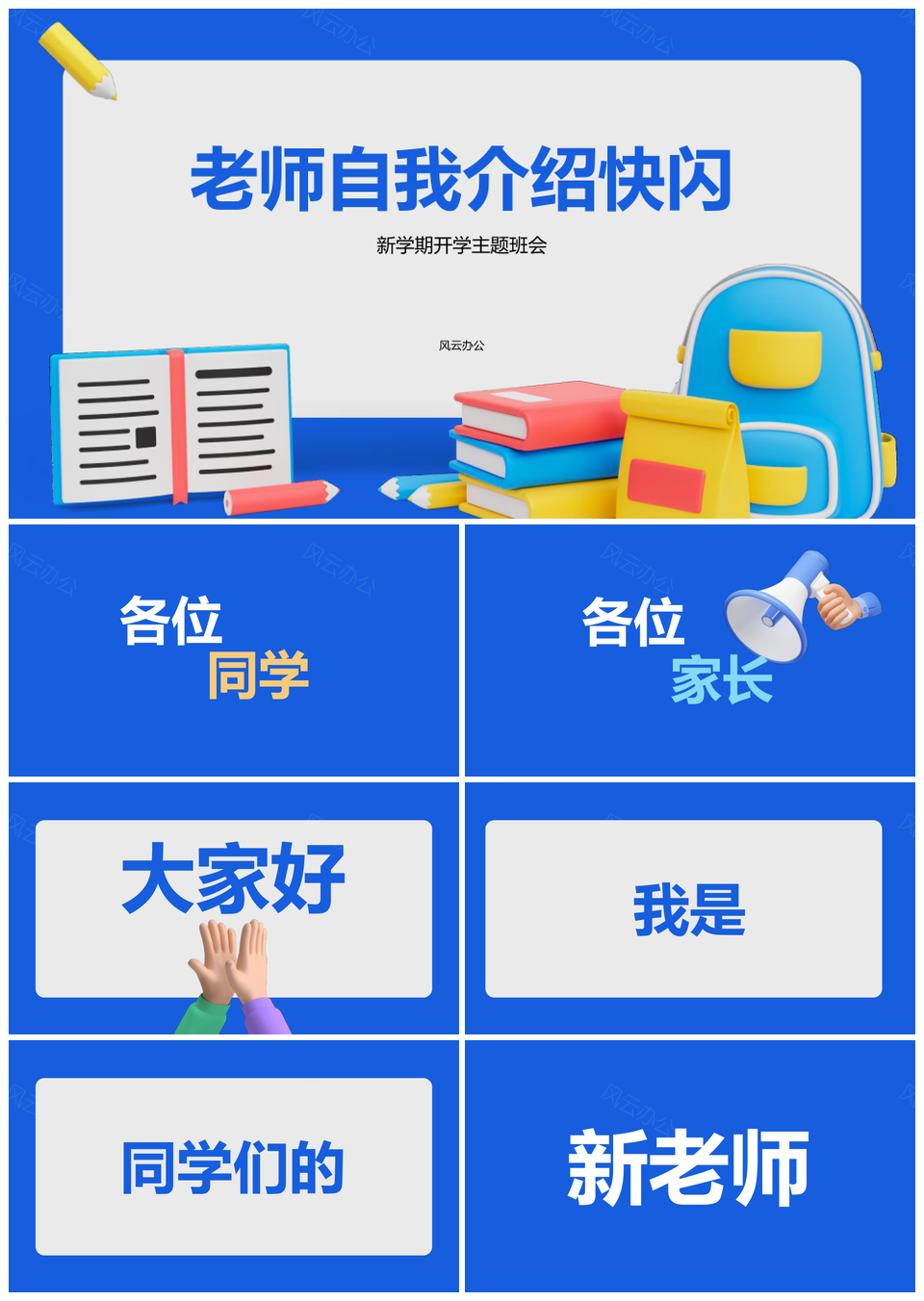 这是一张蓝色3D创意开学季教师自我介绍快闪动画班会书本PPT模板,包含蓝色、3D、创意、开学季、教师、自我介绍、快闪动画、班会、书本等主题内容,也可用作蓝色3D创意开学季、蓝色3D创意动画、蓝色3D创意班会、3D创意开学季动画、3D创意开学季班会、创意开学季教师自我介绍、开学季教师自我介绍快闪、教师自我介绍快闪动画、自我介绍快闪动画班会、快闪动画班会书本、蓝色3D开学季动画、蓝色创意动画班会、3D开学季动画书本、开学季教师班会书本、教师快闪动画班会等PPT场景使用。 风云办公提供的蓝色3D创意开学季教师自我介绍快闪动画班会书本PPT模板,下载格式为pptx,一共49页,作品中文字及图均可以修改和编辑,图片更改请在作品中右键图片并更换,文字修改请直接点击文字进行修改。