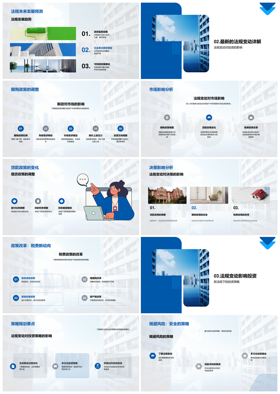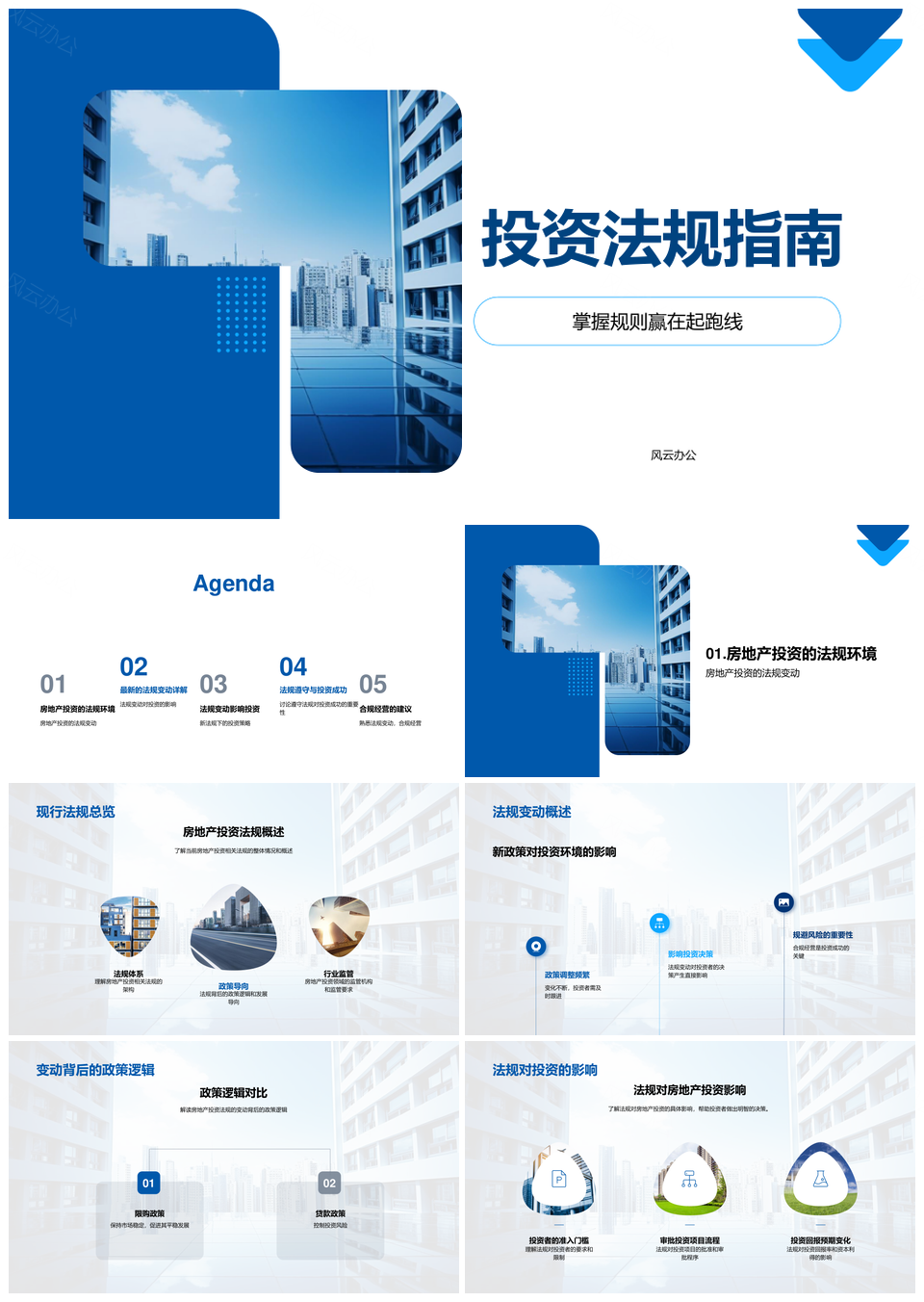 风云办公提供的房地产投资法规政策变动策略指南PPT模板,下载格式为pptx,一共33页,作品中文字及图均可以修改和编辑,图片更改请在作品中右键图片并更换,文字修改请直接点击文字进行修改。