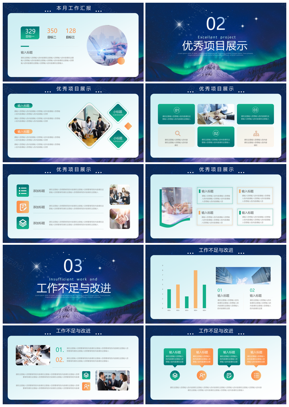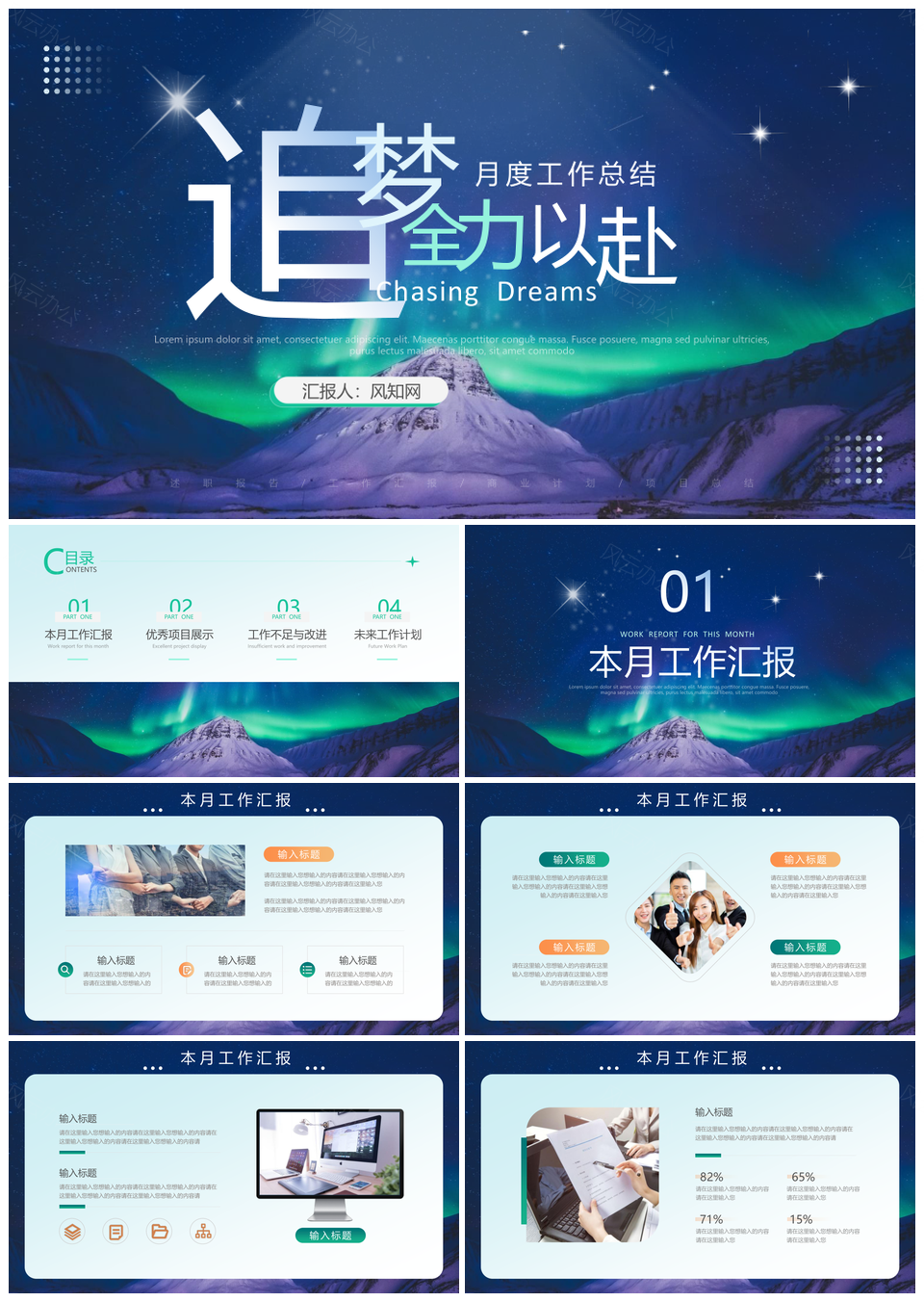 2025蓝绿极光实拍风月度工作述职汇报总结PPT模板推荐