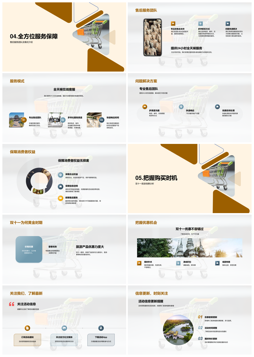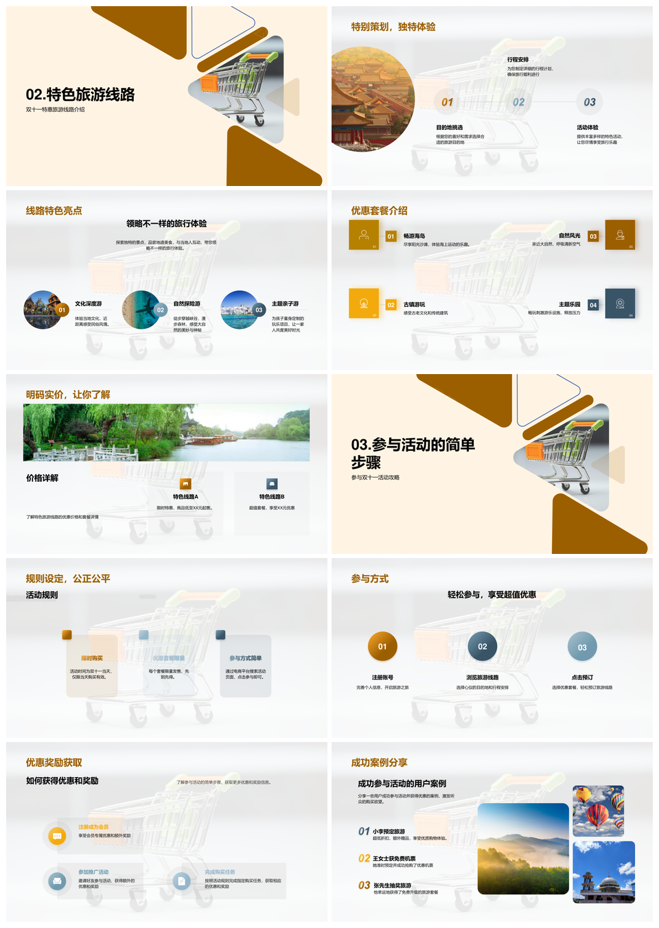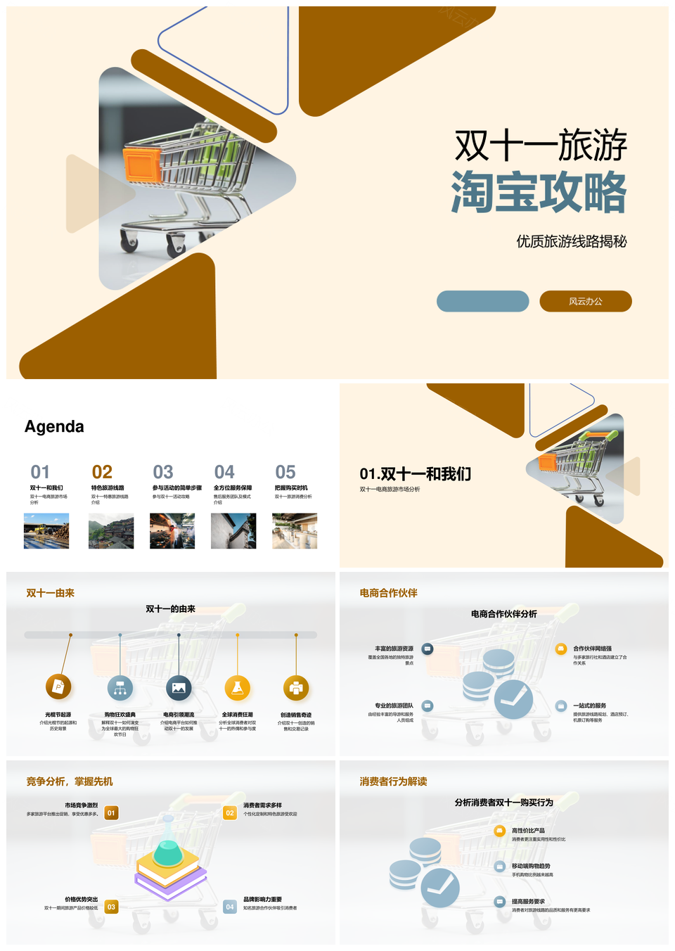 风云办公提供的双十一旅游淘宝优惠套餐攻略活动规则PPT模板,下载格式为pptx,一共28页,作品中文字及图均可以修改和编辑,图片更改请在作品中右键图片并更换,文字修改请直接点击文字进行修改。