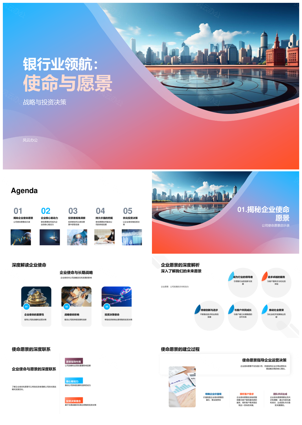 风云办公提供的银行业领航使命愿景战略文化启航新篇PPT模板,下载格式为pptx,一共33页,作品中文字及图均可以修改和编辑,图片更改请在作品中右键图片并更换,文字修改请直接点击文字进行修改。
