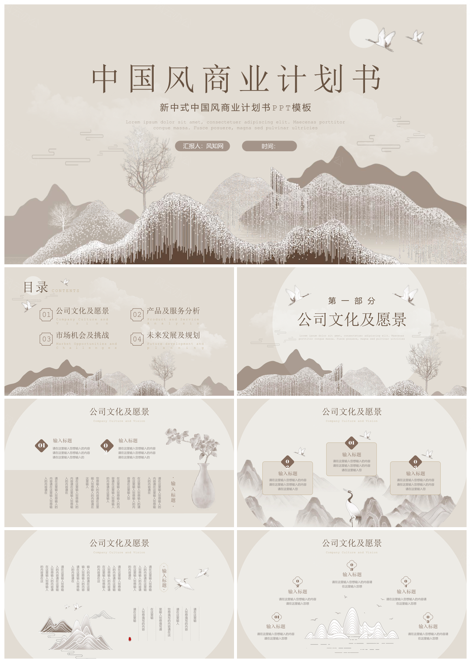 风云办公提供的新中式中国风简约商业计划书PPT模板,下载格式为pptx,一共24页,作品中文字及图均可以修改和编辑,图片更改请在作品中右键图片并更换,文字修改请直接点击文字进行修改。